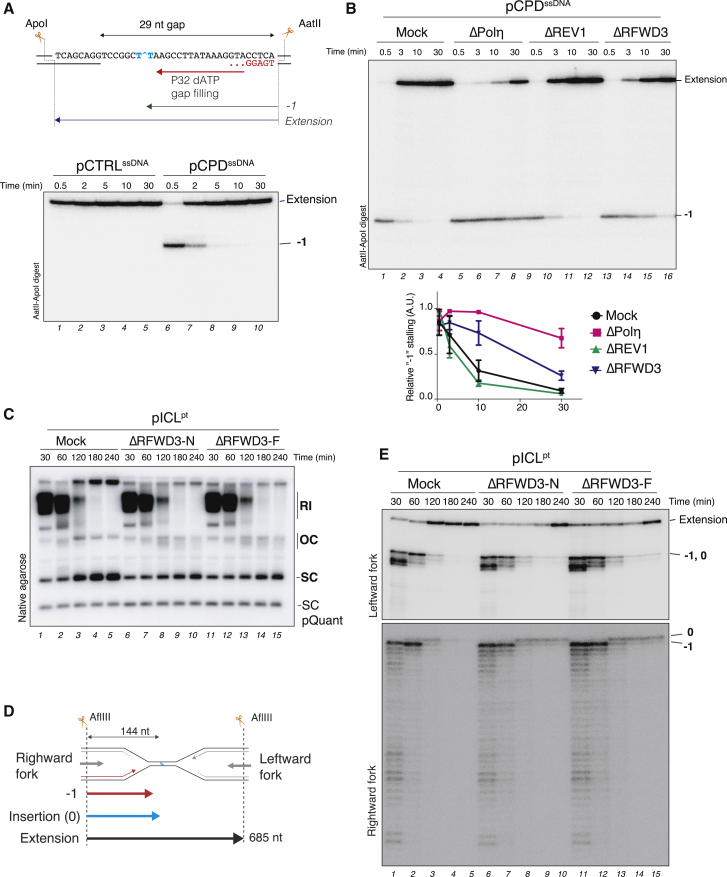 Figure 3. RFWD3 is essential for DNA synthesis across different polymerase-stalling DNA lesions(A) pCTRLssDNA or pCPDssDNA were incubated in non-licensing egg extracts in the presence of [α-32P]dATP. Samples were analyzed on a denaturing polyacrylamide gel following AatII-ApoI digest. Top scheme: extension products generated by AatII-ApoI digest.(B) pCPDssDNA was incubated in mock-, Polη-, REV1-, or RFWD3-depleted non-licensing extracts. Samples were analyzed as in (A). Quantification of the relative intensity of the −1 product for three independent experiments is shown in the lower panel. Intensity of the −1 product was quantified for each lane and normalized to the maximum value. Error bars represent SEM.(C) pICLpt was replicated in mock- or RFWD3-depleted extracts (with either the RFWD3-N or the RFWD3-F antibody), in the presence of pQuant. Reaction samples were analyzed by native agarose gel electrophoresis.(D) Intermediates generated by AflIII digest on pICLpt.(E) Samples from (C) were digested with AflIII and analyzed on a denaturing polyacrylamide gel.