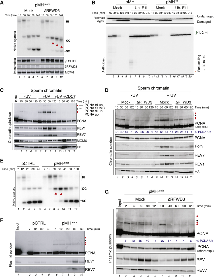Figure 4. RFWD3 regulates PCNA ubiquitylation(A) pMHLeads was replicated in mock- or RFWD3-depleted extracts and analyzed as in Figure 1C (upper panel) or blotted with the indicated antibodies (bottom three panels). Asterisks indicate unspecific bands.(B) pMH or pMHPK were replicated in the presence or absence of ubiquitin E1 inhibitor. Reaction samples were digested and analyzed as in Figure 1E.(C) Sperm chromatin was either untreated or treated with 20 J/m2 UV-C and then replicated in egg extracts. A CDC7 inhibitor was added to block origin firing and DNA replication. Proteins associated with isolated chromatin were blotted with the indicated antibodies. Red dots correspond to PCNA ubiquitylation (likely mono-, di-, and tri-ubiquitin). The black dot corresponds to mono-sumoylated PCNA (see Figure S4K for bands assignment).(D) Sperm chromatin was either untreated or treated with 20 J/m2 UV-C and then replicated in mock- or RFWD3-depleted extracts. Chromatin was isolated, and the proteins associated were blotted with the indicated antibodies. The percentage of ubiquitylated PCNA over unmodified PCNA is indicated underneath the PCNA blot.(E) pCTRL or pMHLeads were replicated in egg extracts and analyzed as in Figure 1C.(F) Reactions from (E) were subjected to plasmid pull-down, and samples were blotted with the indicated antibodies.(G) pMHLeads was replicated in mock-, RFWD3-, or REV1-depleted extracts. Reactions were processed as in (F). The percentage of ubiquitylated PCNA over unmodified PCNA is indicated.