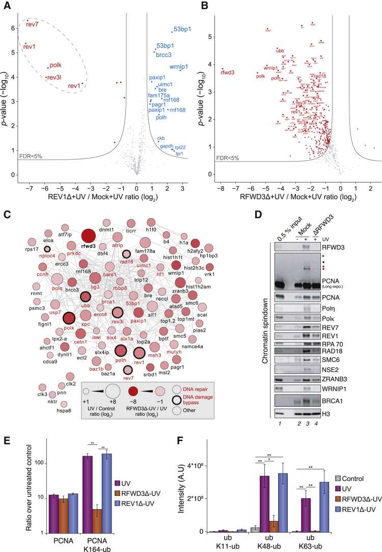 Figure 6. RFWD3 regulates ubiquitin levels and protein recruitment to UV damaged chromatin(A) MS analysis of protein recruitment to UV-treated sperm chromatin in mock- or REV1-depleted extracts. The volcano plot shows the difference in abundance of proteins between the two sample conditions (x axis), plotted against the p value resulting from two-tailed Student’s t testing (y axis). Proteins significantly down- or upregulated (false discovery rate [FDR] < 5%) in REV1-depleted reactions are represented in red or blue, respectively. n = 4 biochemical replicates. FDR < 5% corresponds to permutation-based, FDR-adjusted q < 0.05. Different isoforms of the same protein can be detected (e.g., REV1).(B) Same experiment as in (A) but comparing mock- to RFWD3-depleted extracts. Small red dots, 1% < FDR < 5%; large red dots, FDR < 1%.(C) STRING network of proteins highly significantly upregulated (FDR < 1%) on UV-treated sperm chromatin compared with mock-treated chromatin and highly significantly downregulated (FDR < 1%) on UV-treated sperm chromatin with RFWD3 depletion compared with mock depletion.(D) An independent experiment was analyzed by immunoblot using the indicated antibodies.(E) Average PCNA and PCNA K164-ubiquitin abundance on sperm chromatin identified by tandem mass spectrometry (MS/MS), quantified in a label-free manner, and plotted as a ratio over untreated control. n = 4 biochemical replicates. Error bars represent SEM. ∗∗p < 0.01, via two-tailed Student’s t testing.(F) Quantification of ubiquitin linkages on sperm chromatin directly identified by MS/MS via diglycine-modified lysine residues in the corresponding peptide sequences and quantified in a label-free manner. n = 4 biochemical replicates. Error bars represent SEM. ∗p < 0.05, ∗∗p < 0.01, via two-tailed Student’s t testing.