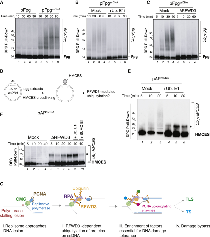 Figure 7. RFWD3 simulates ubiquitylation of proteins on ssDNA(A) Fpg bacterial glycosylase was crosslinked to either double-stranded (pFpg) or single-stranded DNA (pFpgssDNA) and added to SPRTN-depleted non-licensing egg extracts. DPC pull-down under stringent conditions was performed at the indicated time points, and samples were blotted against crosslinked Fpg. Slow mobility bands represent ubiquitylated Fpg species (see B).(B) pFpgssDNA was incubated in SPRTN-depleted non-licensing extracts, and ubiquitin E1 inhibitor was added where indicated. Plasmids were recovered, and samples were blotted against Fpg as in (A).(C) pFpgssDNA was incubated in mock- or RFWD3-depleted non-licensing extracts (also depleted of SPRTN) for the indicated time points and samples processed as in (A).(D) Generation of an AP site on ssDNA (pAPssDNA) to induce HMCES crosslinking.(E) pAPssDNA was incubated in SPRTN-depleted non-licensing extracts, and ubiquitin E1 inhibitor was added where indicated. Plasmids were recovered, and proteins were blotted against HMCES. The black dot indicates sumoylated HMCES (see F).(F) pAPssDNA was incubated in mock- or RFWD3-depleted non-licensing extracts (depleted of SPRTN), and ubiquitin E1 inhibitor or SUMO E1 inhibitor was added where indicated. Plasmids were recovered and analyzed as in (D).(G) Model illustrating the role of RFWD3 in gap-filling DNA synthesis (see Discussion).