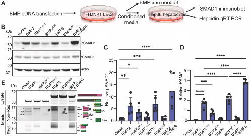 Figure 3. Cleavage of both sites of BMP2 is required to generate fully active BMP2 homodimers in TMNK1 liver endothelial cells. (A-E) TMNK1 cells were transfected with cDNAs encoding wild type or cleavage mutant BMP2 or BMP6 precursors or wild type BMP2 together with BMP6. BMP levels were analyzed 24 h later by probing immunoblots of cell lysates and conditioned media with antibodies specific for the HA tag in each ligand. Conditioned media was applied to Hep3B cells for 6 h, after which cell lysates and RNA were collected, pSMAD1 levels were analyzed by immunoblot, and HAMP levels were analyzed by qPCR as illustrated (A). Representative pSMAD1 immunoblot (B). The relative level of pSMAD1 normalized to actin (C) or HAMP normalized to RPL19 (D) and reported relative to that in cells transfected with empty vector is shown. Data are from a minimum of four independent experiments (mean ± SD) (∗p < 0.05, ∗∗p < 0.01, ∗∗∗p < 0.001, ∗∗∗∗p < 0.0001as determined by ANOVA with Tukey post hoc test). Immunoblots of transfected TMNK1 cell lysates under reducing conditions and media under reducing (Red) or non-reducing (Non-Red) conditions probed with antibodies specific for the HA epitope in the ligand domain. Bands corresponding to precursor proteins, ligand dimers and monomers illustrated to the right of the gel (E).