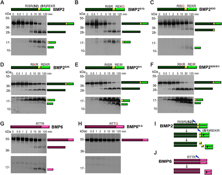 Figure 1. BMP2 is sequentially cleaved at two sites while BMP6 is cleaved at one site within the prodomain.A–H, radiolabeled precursor proteins were synthesized using rabbit reticulocyte lysate and incubated with recombinant furin. Aliquots were removed at different time points and analyzed by SDS-PAGE followed by autoradiography. Bands corresponding to the precursor, prodomain and ligand fragments are indicated to the right of the gel. In vitro cleavage of wild-type (A) and mutant forms of BMP2 in which one of the two cleavage sites is mutated to prevent cleavage (B, C) or in which both sites are mutated to optimal (D; BMP2S2K) or minimal (E; BMP2S1I) furin motifs, or in which optimal and minimal furin motifs are switched (F; BMP2S2K/S1I) (illustrated above each panel. In vitro cleavage of wild-type (G) and cleavage mutant (H) BMP6 precursor protein. In A-H, top panels show a short exposure and bottom panels a longer exposure of the same gel. Fig. S1 shows a single long exposure of the intact gel shown in each panel. I–J, schematic illustration of cleavage of BMP2 (I), which is sequentially cleaved at the S2 and then the S1 site and BMP6 (J), which is cleaved at only one site.