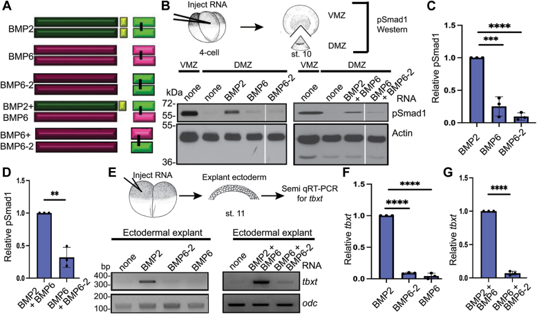 Figure 4. The prodomain of BMP2 is sufficient to generate active BMP6 homodimers and BMP2/6 heterodimers in Xenopus. (A) Schematic illustration of homodimeric and heterodimeric ligands generated from native BMP2 and BMP6 and chimeric BMP2-6 precursor proteins. (B) BMP RNAs were injected individually or together near the dorsal midline of four-cell embryos. VMZ and DMZ explants were collected at stage 10 and pSmad1 levels were analyzed by immunoblot. Representative pSmad1 immunoblots in embryos expressing homodimeric (left panel) and heterodimeric (right panel) ligands are shown. Actin levels were analyzed in duplicate samples as a loading control. (C-D) The relative level of pSmad1, normalized to actin and reported relative to that in embryos expressing native BMP2 alone (C) or together with native BMP6 (D) is shown. Data are from three independent experiments (mean ± SD) (∗p < 0.05, ∗∗p < 0.01, ∗∗∗p < 0.001 as determined by unpaired t test). (E) BMP RNAs were injected alone or together into one animal pole blastomere of 2-cell Xenopus embryos. Ectoderm was explanted at stage 11 and expression of tbxt was analyzed by semi qRT-PCR in embryos expressing homodimeric (left panel) or heterodimeric (right panel) ligands. All lanes from the same experiment, aligned following removal of an intervening lane (marked by white bar) using photoshop. (F-G) The relative level of tbxt normalized to odc and reported relative to that in embryos expressing native BMP2 alone (F) or together with native BMP6 (G) is shown. Data are from three independent experiments (mean ± SD) (∗p < 0.05, ∗∗∗p < 0.001, ∗∗∗∗p < 0.0001 as determined by unpaired t test).