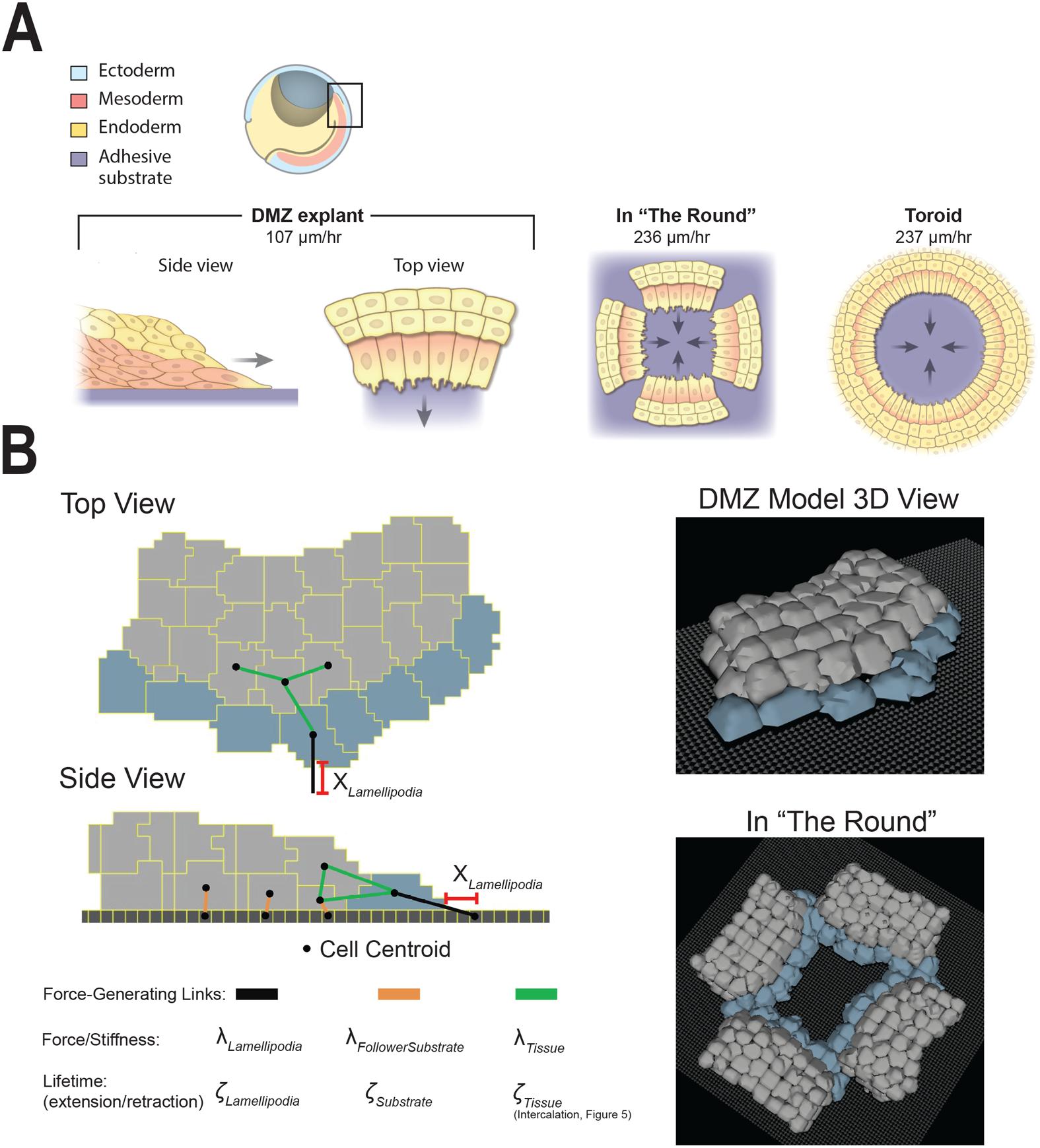 Fig. 1.Modeling Xenopus mesendoderm tissue. (A) Illustration of gastrula-stage embryos and explants. Hemisected embryo at top, box indicates approximate location of dorsal marginal zone (DMZ) tissue explant dissected from the embryo and placed on an adhesive substrate; side and top views of adherent explant illustrate cellular organization of mesendoderm. Four separate DMZ explants are arranged as shown to generate the ‘in-the-round’ (ITR) geometry. The ITR approximates a single toroid or donut explant comprised of the entire mesendodermal mantle. Arrows indicate the direction of travel of the leading row cells in each preparation. Migration speeds taken from Davidson et al., 2002 are shown for each explant configuration. (B) Representative DMZ computational model images and schematic of critical parameters are shown. See Materials and Methods for the exhaustive parameter table and description of all parameters. Additional figures illustrating Xenopus laevis gastrulation and explant preparation procedures can be found in Davidson et al., 2002 and Sonavane et al., 2017.