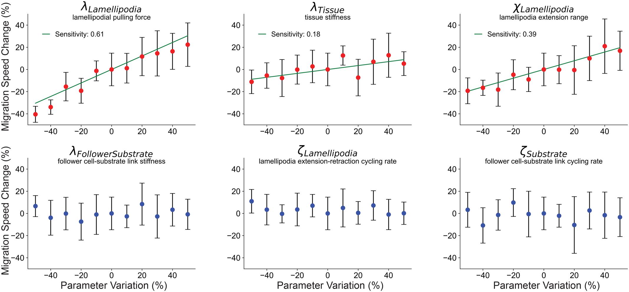 Fig. 2.Leading-edge parameters drive migration speed of the DMZ explant. One-dimensional sensitivity analysis of selected key parameters responsible for the migratory behavior of the explant: (lLamellipodia) lamellipodial pulling force, (lTissue) tissue stiffness, (χLamellipodia) lamellipodial extension distance, (lFollowerSubstrate) follower cell–substrate attachment stiffness, (ζLamellipodia) lamellipodial extension–retraction rate, and (ζSubstrate) follower cell–substrate attachment cycling rate. Parameter values ranged from −50% to +50% from baseline by equation reference ±% *reference, n=10, markers show means±s.d. Red markers indicate P<0.05 by one-way ANOVA. Sensitivity given as slope of linear regression line (green) through parameters identified as significant via one-way ANOVA. See Materials and Methods for additional parameter details.