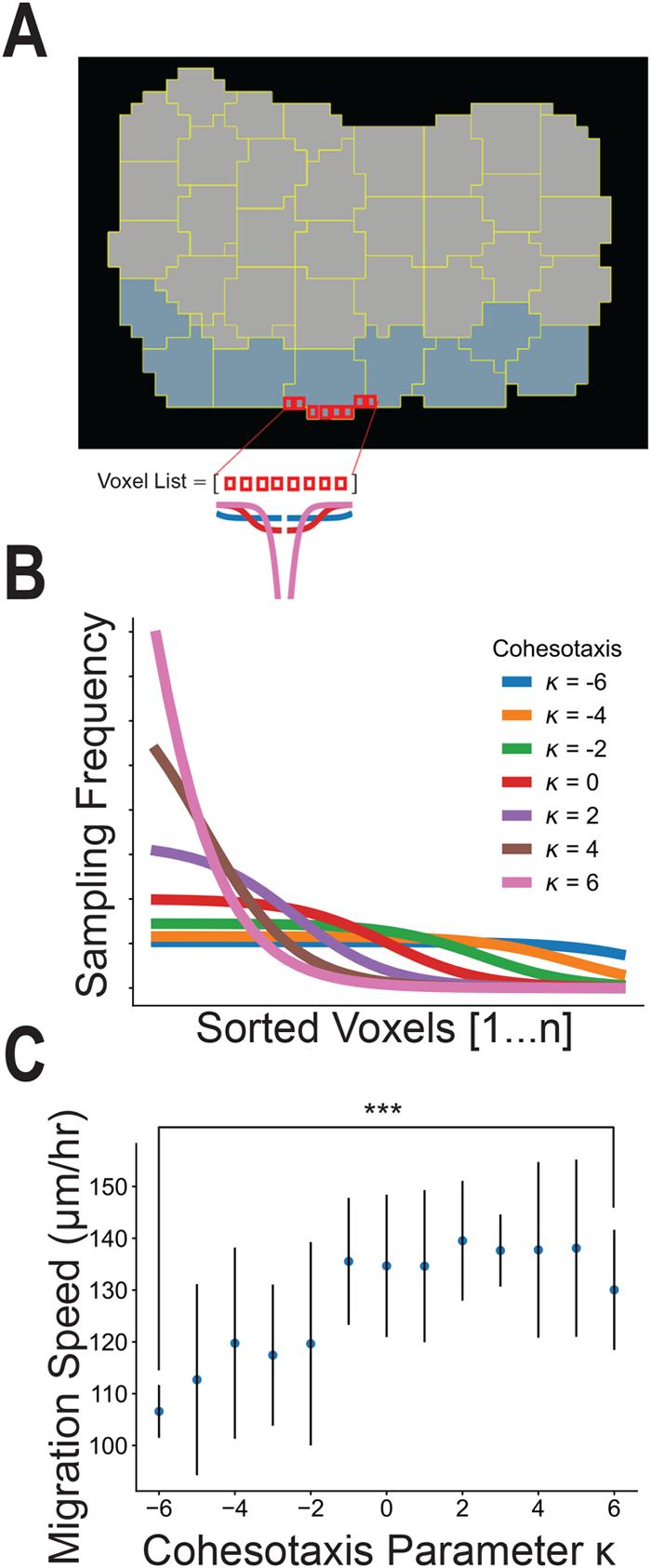 Fig. 3.Cohesotaxis increases the speed of migration. Cohesotaxis representation as a directional migratory bias for convex cells. (A) Preferential selection of voxels to establish a persistent direction of migration is described. (B) Probability of selecting from the sorted list of free voxels to produce the bias described in panel A and derived in Materials and Methods. (C) Measure of migration speed for different values of cohesotaxis parameter κ applied (n=10 per κ value, ***denotes significance at P<0.001 by independent samples t-test).