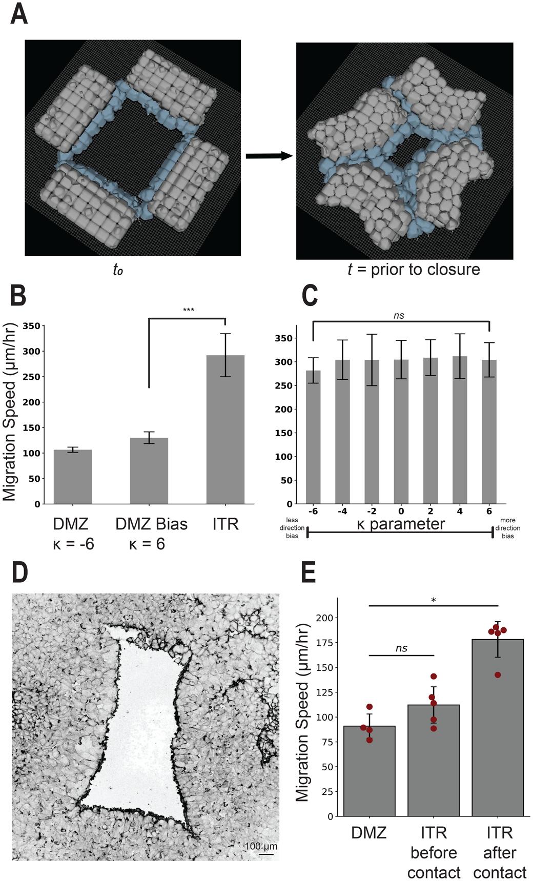 Fig. 4.‘In-the-round’ geometry increases migration speed of the DMZ explant. ITR experiment configuration. (A) Representative images displaying model initialization at t0 and time to closure. (B) Migration speed comparison with the DMZ explant with and without bias (K=−6,6), *** indicates P<0.001 by independent samples t-test. (C) Effects of modulating the cohesotaxis parameter upon tissue migration speed in the ITR configuration, ns indicates P>0.05 by one-way ANOVA. Simulations results in panels B and C include n=10, mean±s.d. (D) Representative image from a biological ITR experiment, before time to closure. (E) Experiments comparing migration speed of a single linear DMZ explant and the explants in an ITR configuration before and after collision as performed in Davidson et al., 2002, n=4, mean±s.d., significance at P<0.05 by independent samples t-test.