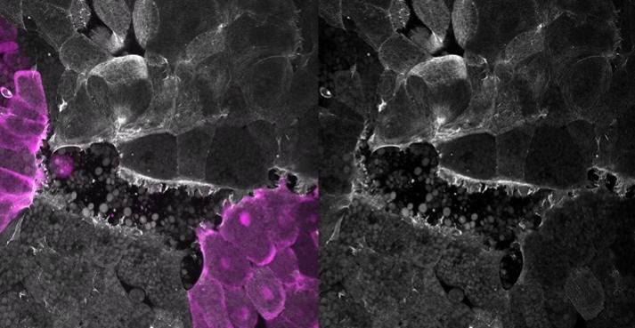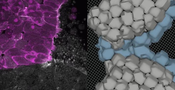 Movie 5.Interface between two DMZs in vitro (left) and in silico (right) migrating from 4 DMZs placed ITR. Left: Actin (greyscale) was labeled by injection of mRNA encoding LifeAct-RFP. Two of the four DMZs were labeled with Alexa 488 dextran (magenta-left panel) to identify individual DMZs. Confocal Z-stacks were collected at 3 min intervals (11 frames). Representative frames from a ITR simulation are shown on the right.