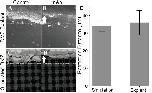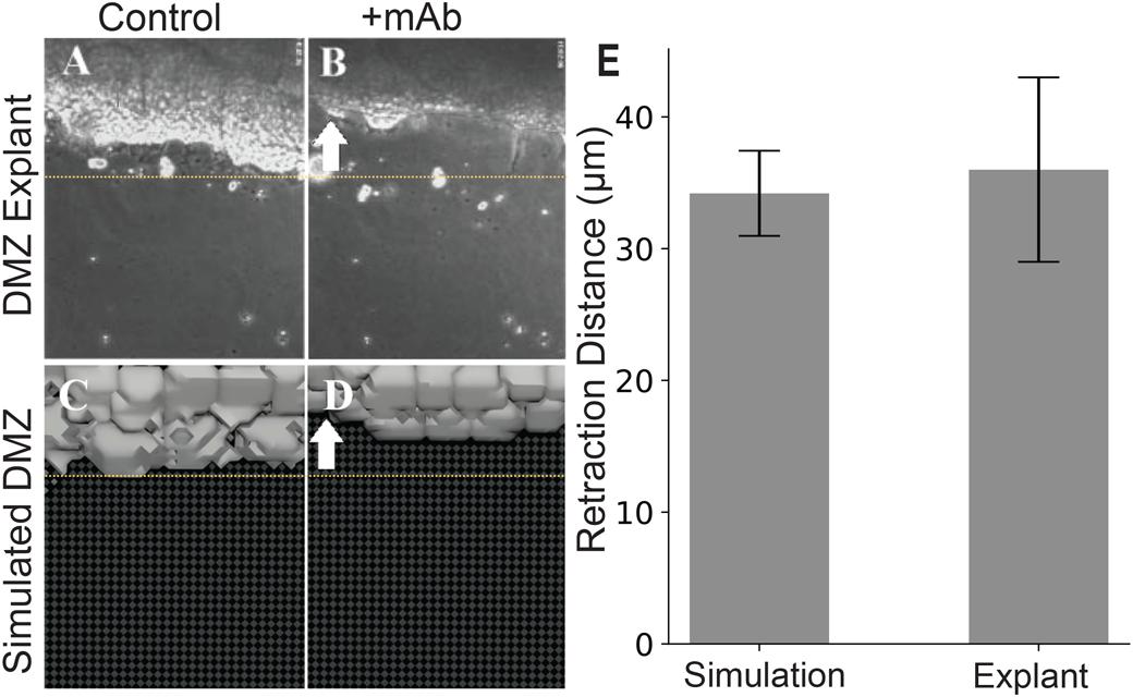 Fig. 6.In-silico disruption of cell–substrate binding results in comparable behavior to biological experiments. (A,B) Top-down (en face) images from the experiment in Davidson et al., 2002 (A) before and (B) after disruption of cell-substrate binding following addition of integrin a5b1 function-blocking mAB P8D4. Similar top-down images from a representative simulation (C) before and (D) after disruption of leader cell–substrate binding. White arrows represent the (B) experimentally observed and (D) simulated retraction direction. Yellow dashed lines in panels A–D are included as a visual guide to DMZ retraction limit. (E) Quantitative comparison of measured retraction distances (mean±s.e.m) from 10 experiments each are shown. Panels A and B are reproduced from Davidson et al. (2002) with permission from the publisher, Elsevier.