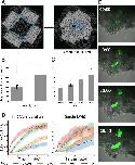 Fig. 5.Top-down intercalation increases migration speed in the DMZ explant. (A) Representative image of the ITR experiment after addition of rules to allow for passive intercalation. (B) Comparison of migration speed of closure with and without the addition of passive intercalation (n=10, mean±s.d., *** denotes significance at P<0.001 by independent samples t-test), and (C) migration speed measurements with different probabilities of cell–cell rearrangement per timestep, which correspond with likelihood of observed cell intercalation n=10, mean±s.d., for all parameterizations. Quantified number of cells (mean±s.d.) on the substrate throughout a 20 min simulated time course for all values of ζTissue for both the single DMZ and ITR in-silico configurations in (D), n=10 for all parameterizations. (E) Fluorescent dextran labeled mesendoderm cells sprinkled on top of an unlabeled DMZ explant reveal cell intercalation toward the substrate level over a 30 min time course confirming model intercalation behavior.