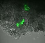 Movie 7.Timelapse movie showing integration of single dextran Alexa488-labeled cells applied onto an unlabeled DMZ explant migrating on fibronectin substrate. Mesendoderm cells, labeled by injection of Alexa488 dextran (green), were dissociated from sibling embryos and placed on top of an unlabeled DMZ migrating on a fibronectin substrate. Confocal Z-stacks were collected at 1 min intervals (32 frames).