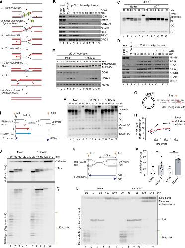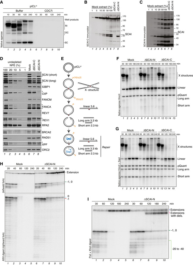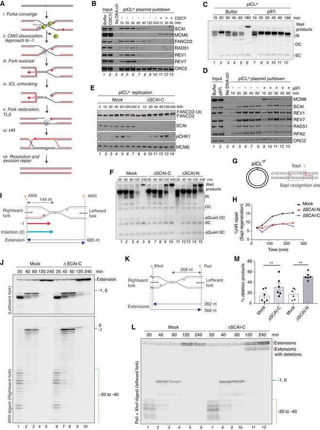 Current model of ICLpt repair in Xenopus egg extracts (Amunugama et al, 2018).pICLpt was isolated via plasmid pull down at the indicated times after incubation in Xenopus egg extract in the presence or absence of CDC7i (100 µM) and associated proteins were analyzed by immunoblotting.pICLpt was replicated in egg extracts in the presence of [α‐32P]dATP for the indicated times, and reactions were analyzed by native agarose gel electrophoresis. The p97 inhibitor NMS‐873 (p97i; 200 μM) was supplemented to the reaction where indicated. Note that in the absence of p97 activity, CMGs are no longer unloaded from the plasmid, leading to accumulation of replication intermediate products (RI) (Fullbright et al, 2016). OC, open circular; SC, supercoiled.Samples from (C) were recovered via plasmid pull down at the indicated time points as in (B) and analyzed by immunoblotting.pICLpt was replicated in mock‐ or SCAI‐C‐depleted egg extracts, and samples collected at the indicated time points were analyzed by immunoblotting.pICLpt was replicated in mock‐ or SCAI‐depleted egg extract in the presence of [α‐32P]dATP for the indicated times, and reactions were analyzed by native agarose gel electrophoresis. ΔSCAI‐C and ΔSCAI‐N denote SCAI immunodepletion with an antibody raised against the C or N terminus of SCAI, respectively; RI, replication intermediates; OC, open circular; SC, supercoiled.Schematic of pICLpt illustrating the SapI site, which is regenerated upon replication‐coupled repair (Knipscheer et al, 2009).Quantification of SapI regeneration in mock or SCAI‐depleted extracts. Note that plasmids containing a SapI site but no ICL account for ~ 5–7% of each pICLpt preparation. Primary data are shown in Fig EV2F and G. A representative of two independent experiments is shown.Schematic of intermediates and extension products generated by AflIII digest of pICLpt.pICLpt was replicated in mock‐ or SCAI‐depleted egg extract in the presence of [α‐32P]dATP for the indicated times, and reactions were digested with AflIII and analyzed on a denaturing polyacrylamide gel. Stalling points relative to the ICL site are indicated.Schematic of intermediates and extension products generated by PsiI+XhoI double digest of pICLpt.Samples in (J) were digested with PsiI+XhoI and analyzed on a denaturing polyacrylamide gel. Stalling points relative to the ICL site are indicated.Quantification of extensions with deletions in (L) at 240 min (mean ± SEM; n = 6 independent experiments; **P < 0.01; two‐tailed paired t‐test).