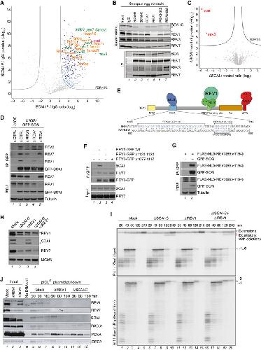 = 2).SCAI, REV7, REV1, and REV3 immunoprecipitates (IP) in NPE were immunoblotted with the indicated antibodies. Asterisks denote antibody cross‐reactivity.Whole proteome MS analysis of mock‐ versus SCAI‐depleted egg extracts. The volcano plot shows the difference in abundance of proteins between the mock reaction and SCAI‐depleted samples (with either N or C antibodies) (X‐axis), plotted against the P‐value resulting from two‐tailed Student’s t‐test (Y‐axis). Proteins significantly down‐regulated (FDR < 5%) in SCAI‐depleted extracts are highlighted in red (n = 4 biochemical replicates; FDR < 5% corresponds to a permutation‐based FDR‐adjusted q‐value of < 0.05).GFP IPs from U2OS or U2OS/GFP‐SCAI cells transfected with indicated siRNAs were immunoblotted with indicated antibodies. Note that a small fraction of REV7 is still immunoprecipitated with GFP‐SCAI in REV3 knockdown cells. This could be due to incomplete knockdown, and/or additional interactions of SCAI with the REV1‐Polζ complex that are independent of REV3.Schematic of SCAI interaction with the REV1‐Polζ complex. The SCAI‐interacting region of human REV3 and its alignment with a homologous region in human AHDC is indicated. NTD, N‐terminal domain; PCD, positively charged domain; Pol, polymerase domain; CTD, C‐terminal domain.GFP IPs from U2OS cells transfected with indicated REV3‐GFP expression constructs were immunoblotted with indicated antibodies.As in (F), except that U2OS or U2OS/GFP‐SCAI cells were transfected with FLAG‐NLS‐REV3(995–1194) expression plasmid.Mock‐, SCAI‐, REV1‐, or SCAI/REV1‐depleted egg extracts were analyzed by immunoblotting with indicated antibodies. Asterisks denote antibody cross‐reactivity.pICLpt was replicated in egg extracts immunodepleted with the indicated antibodies and processed as in Fig 3J and L.pICLpt was replicated in egg extracts immunodepleted with indicated antibodies, isolated at various times via plasmid pull down, and associated proteins were analyzed by immunoblotting.