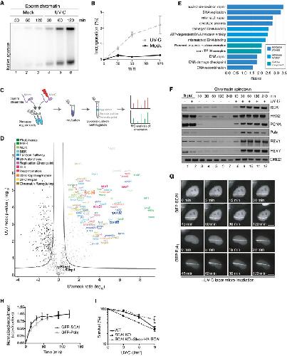 = 0.5).Term enrichment analysis showing GO terms corresponding to proteins significantly recruited to UV‐C‐damaged chromatin (Dataset EV5). All displayed terms were significant with P < 0.02, as determined through Fisher exact testing with Benjamini–Hochberg correction.Sperm chromatin left untreated or irradiated with UV‐C (2,000 J/m2) was isolated at the indicated time points and analyzed by immunoblotting.Representative images of GFP‐SCAI and GFP‐Polη recruitment to UV‐C laser micro‐irradiation in U2OS cells at indicated time points. Scale bar, 10 µm.U2OS cells stably expressing GFP‐SCAI or transiently transfected with GFP‐Polη were subjected to UV‐C laser micro‐irradiation. At indicated time points, GFP fluorescence intensities at damage sites over the nuclear background were quantified. Recruitment was normalized to the time point of maximal recruitment (mean ± SEM; n = 3 independent experiments; at least 30 cells analyzed per condition).Clonogenic survival of U2OS cells subjected to indicated doses of UV‐C (mean ± SEM; n = 3 independent experiments).