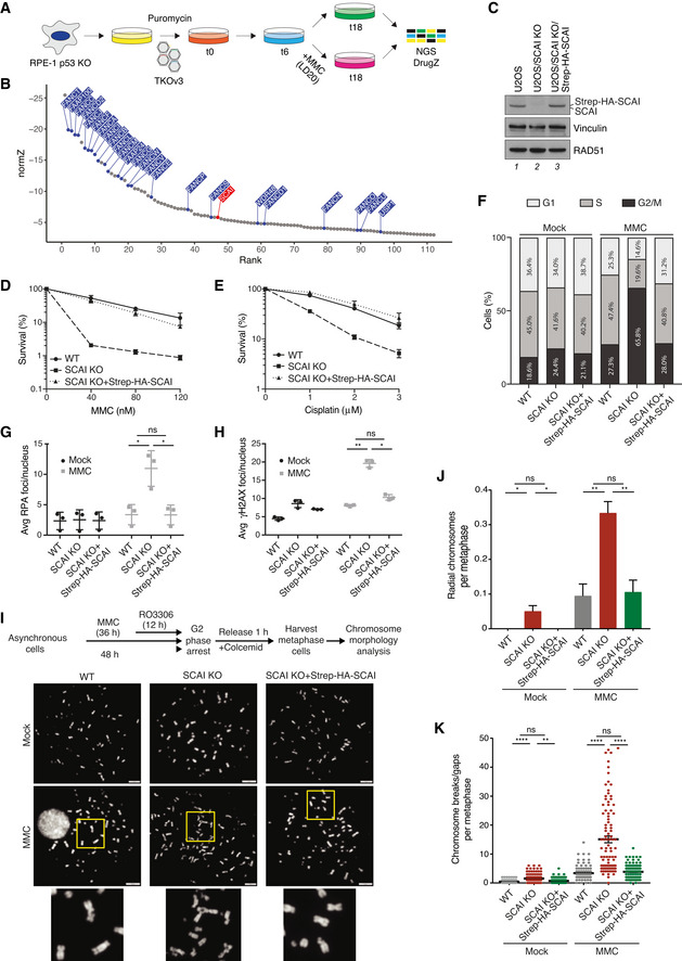 Schematic outline of genome‐scale CRISPR‐Cas9 screen for genes whose KO sensitizes human RPE‐1 cells to MMC. LD20, 20% lethal dose; NGS, next‐generation sequencing.DrugZ analysis of sgRNA depletion in CRISPR screen in (A) following low‐dose MMC treatment (n = 2 technical replicates). FA genes are highlighted in blue; SCAI is highlighted in red.Immunoblot analysis of U2OS WT, U2OS/SCAI KO, and U2OS/SCAI KO cells stably reconstituted with Strep‐HA‐SCAI (U2OS/SCAI KO/Strep‐HA‐SCAI).Clonogenic survival of U2OS WT, U2OS/SCAI KO, and U2OS/SCAI KO/Strep‐HA‐SCAI cells subjected to indicated doses of MMC for 24 h (mean ± SEM; n = 3 independent experiments).As in (D), except that cells were treated with Cisplatin for 24 h (mean ± SEM; n = 3 independent experiments).U2OS WT, U2OS/SCAI KO, and U2OS/SCAI KO/Strep‐HA‐SCAI cells were treated or not with MMC (9 nM) for 48 h, fixed, and co‐stained with PCNA antibody and DAPI. Cell cycle distribution was analyzed by quantitative image‐based cytometry (QIBC) (≥ 2,000 cells analyzed per condition). Data from a representative experiment are shown.U2OS WT, U2OS/SCAI KO, and U2OS/SCAI KO/Strep‐HA‐SCAI cells were treated or not with MMC (90 nM) for 1 h, fixed 24 h later, and co‐stained with RPA2 antibody and DAPI. RPA2 foci were quantified by QIBC (≥ 3,000 cells analyzed per condition; mean ± SD; n = 3 independent experiments; *P < 0.05; ns, not significant, two‐tailed paired t‐test).As in (G), except that cells were co‐stained with γH2AX antibody and DAPI (≥ 3,000 cells analyzed per condition; mean ± SD; n = 3 independent experiments; *P < 0.05; **P < 0.01; ns, not significant, two‐tailed paired t‐test).Experimental workflow for metaphase chromosome morphology analysis (top) and representative images of metaphase spreads from indicated cell lines treated or not with MMC (bottom). DNA was stained with DAPI. Scale bars, 10 µm.Quantification of radial chromosomes in (I) (mean ± SD; 180 cells analyzed per condition; n = 3 independent experiments; *P < 0.05; **P < 0.01, ns, not significant, two‐tailed t‐test).Quantification of chromosomal breaks/gaps in (I) (mean ± SEM; 99 metaphase cells analyzed for each condition pooled from three independent experiments; **P < 0.01; ****P < 0.0001, ns, not significant, Mann–Whitney U test).