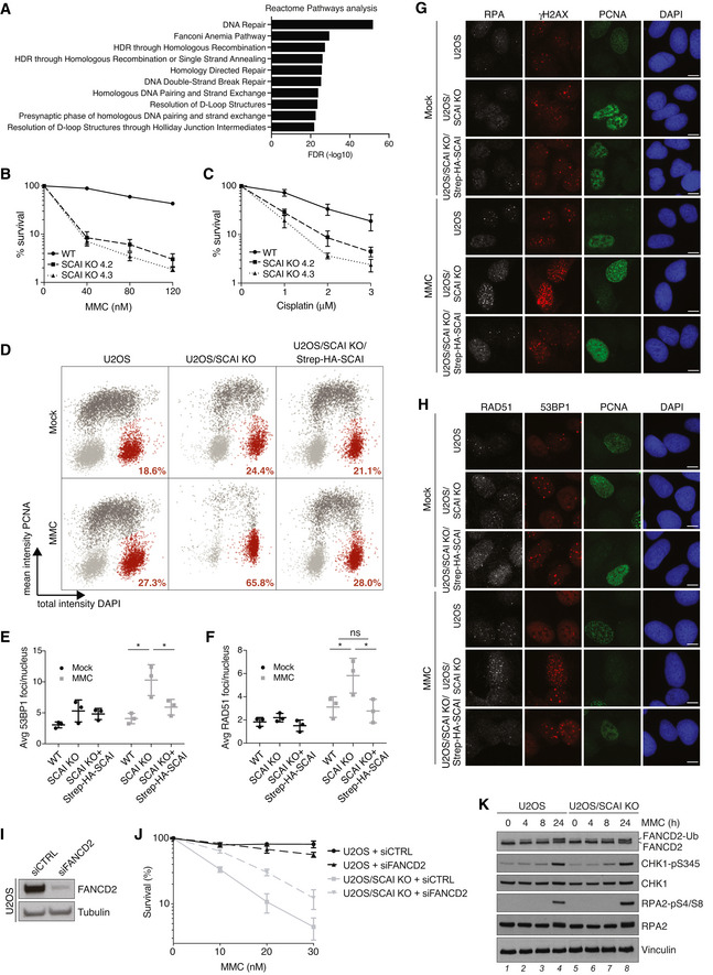 GO term analysis of significant hits (NormZ < −3) in CRISPR‐Cas9 screen in Fig 1A, using Reactome pathways from PANTHER16.0.Clonogenic survival of U2OS WT and U2OS/SCAI KO cells subjected to indicated doses of MMC for 24 h (mean ± SEM; n = 3 independent experiments).As in (B), except that cells were treated with indicated doses of cisplatin for 24 h (mean ± SEM; n = 3 independent experiments).Scatter plot showing cell cycle distribution of cells in Fig 1F. Light grey, G1 phase; dark grey, S phase; red: G2/M phase. Proportion of cells in G2/M phase is indicated.U2OS WT, U2OS/SCAI KO, and U2OS/SCAI KO/Strep‐HA‐SCAI cells were treated or not with MMC (90 nM) for 1 h, fixed 24 h later, and co‐stained with 53BP1 antibody and DAPI. 53BP1 foci were quantified by QIBC (≥ 3,000 cells analyzed per condition; mean ± SD; n = 3 independent experiments; *P < 0.05; two‐tailed paired t‐test).As in (E), except that cells were stained with RAD51 antibody (≥ 3,000 cells analyzed per condition; mean ± SD; n = 3 independent experiments; *P < 0.05; ns, not significant, two‐tailed paired t‐test).Representative images of the experiments in Fig 1G and H. Scale bar, 10 µm.Representative images of the experiments in (E) and (F). Scale bar, 10 µm.Immunoblot analysis of FANCD2 siRNA knockdown efficiency in U2OS cells.Clonogenic survival of U2OS and U2OS/SCAI KO cells transfected with non‐targeting control (CTRL) or FANCD2 siRNAs and subjected to indicated doses of MMC for 24 h (mean ± SEM; n = 3 independent experiments).Immunoblot analysis of U2OS WT and U2OS/SCAI KO cells harvested at the indicated times after exposure to MMC (0.5 µM).