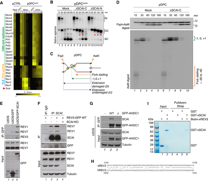 Heat map depicting the mean of the Z‐scored Log2 label‐free quantification LFQ intensity from four biochemical replicates of pCTRL and pDPCLeads replication in Xenopus egg extracts (data originally published in Larsen et al (2019)). Where indicated, Geminin was added to block DNA replication, and ubiquitin‐vinyl sulfone (Ub‐VS) was added to deplete the pool of free ubiquitin from the extracts.pDPCLeads was replicated in mock‐, SCAI‐C‐, and SCAI‐N‐depleted egg extracts in the presence of [α‐32P]dATP. Reactions were analyzed by native agarose gel electrophoresis. Red arrowheads indicate accumulation of open circular (OC) molecules caused by a TLS defect.Nascent leading strand and extension products generated upon FspI+AatII digest of pDPC. Double digestion generates shorter damaged and longer undamaged extension products. The CMG helicase is depicted in green and the crosslinked M.HpaII protein in grey.pDPC was replicated in mock‐ or SCAI‐depleted Xenopus egg extract in the presence of [α‐32P]dATP. Samples were digested with FspI+AatII and analyzed on a denaturing polyacrylamide gel. Stalling points relative to the DPC site are indicated. U, undamaged; D, damaged extension product.U2OS cells or derivative lines stably expressing GFP or GFP‐SCAI were subjected to GFP IP followed by immunoblotting with indicated antibodies.U2OS WT or SCAI KO cells that were transfected with REV3‐GFP where indicated were subjected to IP with IgG or SCAI antibody followed by immunoblotting.GFP IPs from U2OS cells transfected with indicated GFP‐AHDC1 expression constructs were analyzed by immunoblotting.Alignment of the SCAI‐interacting regions of human and Xenopus REV3 proteins. Asterisk indicates positions with a conserved amino acid; colon indicates conservation between amino acids with strongly similar properties; period indicates conservation between amino acids with weakly similar properties.Recombinant GST or GST‐xSCAI proteins incubated or not with Biotin‐xREV3 peptide (aa 1110–1179) were subjected to streptavidin pull down and analyzed by Coomassie staining.