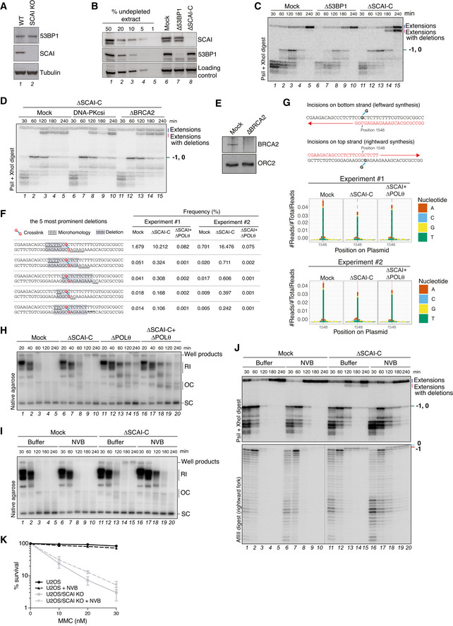 Whole cell extracts of U2OS and U2OS/SCAI KO cells were analyzed by immunoblotting with indicated antibodies.Mock‐, 53BP1‐, or SCAI‐C‐depleted egg extracts were analyzed by immunoblotting with indicated antibodies.pICLpt was replicated in extracts immunodepleted in mock‐, 53BP1‐, or SCAI‐C‐depleted egg extracts digested with PsiI+XhoI and resolved on a denaturing polyacrylamide gel.pICLpt was replicated in SCAI‐C‐depleted extracts that were also depleted of BRCA2, or supplemented with DNA‐PKcs inhibitor (NU7441; 100 µM) where indicated. Reaction samples were digested with PsiI+XhoI and analyzed on a denaturing polyacrylamide gel.Mock‐ or BRCA2‐depleted egg extracts were analyzed by immunoblotting with indicated antibodies.Most frequent deletion products in sequencing data in Fig 5A. In red, crosslinked guanines; highlighted in grey, deletions; underlines, microhomology regions.Schematic representation of DNA synthesis occurring across the adducted base following DNA incisions on either the top or bottom strand. The denoted nucleotide position 1,548 corresponds to the insertion 0 position when incisions occur in the bottom strand or to the −1 position when incisions occur in the top strand. Sequencing products of correct length from Fig 5A were analyzed for their nucleotide misincorporation distribution (bottom graphs). Misincorporation is based on the bottom strand read.Samples in Fig 5C were analyzed by native agarose gel electrophoresis.pICLpt was replicated in mock‐ or SCAI‐depleted extracts treated or not with Novobiocin (NVB; 150 µM) in the presence of [α‐32P]dATP, and reactions were analyzed by native agarose gel electrophoresis. RI, replication intermediates; OC, open circular; SC, supercoiled.Samples in (I) were digested with PsiI+XhoI or AflIII and analyzed on a denaturing polyacrylamide gel.Clonogenic survival of U2OS and U2OS/SCAI KO cells treated or not with Novobiocin (NVB; 50 µM) and subjected to various doses of MMC for 24 h (mean ± SEM; n = 3 independent experiments).