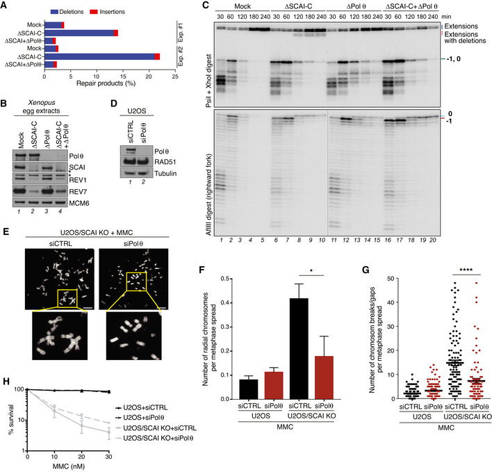 pICLpt was replicated in egg extracts immunodepleted with indicated antibodies. Replication samples were amplified by PCR and analyzed by next‐generation sequencing for deletions and insertions. Results from two independent experiments are shown.Immunoblot analysis of extracts immunodepleted with indicated antibodies. Asterisks denote antibody cross‐reactivity.pICLpt was replicated in extracts immunodepleted as in (B), digested with PsiI+XhoI or AflIII and resolved on a denaturing polyacrylamide gel.Immunoblot analysis of Polθ siRNA knockdown efficiency in U2OS cells.Representative images of metaphase spreads from U2OS/SCAI KO cells transfected with indicated siRNAs and processed as in Fig 1I. Scale bars, 10 µm.Quantification of radial chromosomes in (E) (mean ± SD; 1,197, 241, 155, and 90 metaphase cells analyzed per condition (left to right) pooled from three independent experiments; *P < 0.05, two‐tailed t‐test).Quantification of chromosomal breaks/gaps in (E) (mean ± SEM; 150, 150, 114, and 90 metaphase cells analyzed per condition (left to right) pooled from three independent experiments; ****P < 0.0001, Mann–Whitney U test).Clonogenic survival of U2OS and U2OS/SCAI KO cells transfected with non‐targeting control (CTRL) or Polθ siRNAs and subjected to indicated doses of MMC for 24 h (mean ± SEM; n = 3 independent experiments).