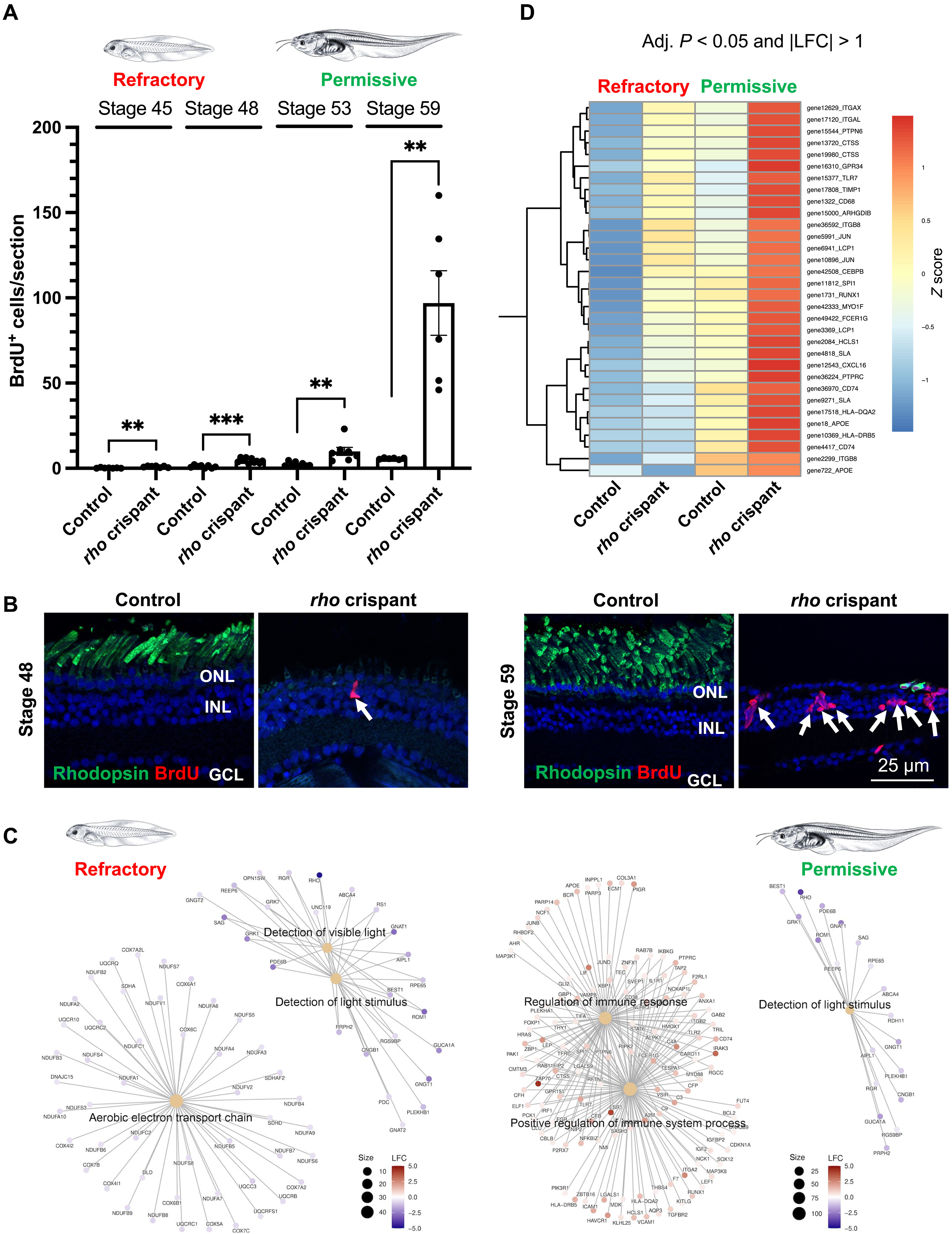 (A and B) Quantification of BrdU-positive cells in control and rho crispant tadpole retinal sections at different stages, following exposure to BrdU solution for 3 days. Data are represented as means ± SEM, and each point represents one retina. **P < 0.01; ***P < 0.001 (Mann-Whitney test). Shown in (B) are representative images of retinal sections colabeled for BrdU and rhodopsin at a young (refractory) and old (permissive) tadpole stage. Rhodopsin labeling shows the efficacy of rho knockout, and the absence of outer segments indicates degeneration of rods in rho crispants at both stages. Nuclei are counterstained with Hoechst. Arrows point to BrdU-positive cells. GCL, ganglion cell layer; INL, inner nuclear layer; ONL, outer nuclear layer. (C) Gene-Concept network (cnetplot) based on the enriched biological processes at refractory and permissive stages (rho crispant tadpoles relative to controls), retrieved from GSEA results of LFC ranked gene list (see table S1). (D) Extract from the clustered heatmap of DEGs belonging to the microglial molecular signature. All genes regrouped here show a higher expression at the permissive stage in rho crispant tadpoles compared to all other conditions (refer to fig. S4 for the complete heatmap).