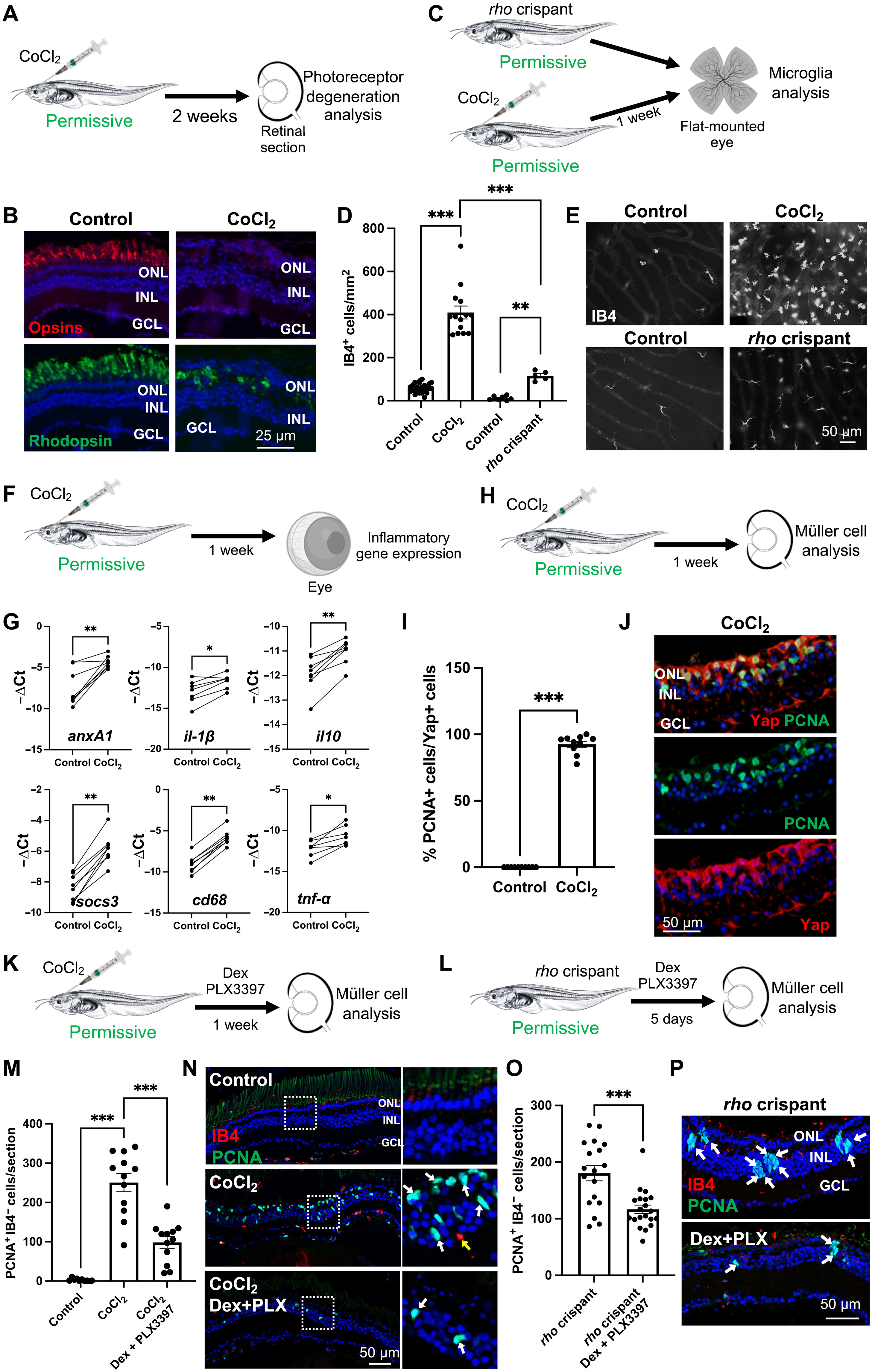 (A) Procedure used in (B). Tadpoles at a permissive stage were intraocularly injected with 25 mM CoCl2 and processed 2 weeks later for photoreceptors immunolabeling. (B) Retinal sections labeled for opsins (cones) or rhodopsin (rods). (C) Procedure used in (D) and (E). CoCl2-injected or rho crispant tadpoles and their respective controls were processed at a permissive stage for immunolabeling of microglia on flat-mounted retinas. (D and E) Quantification of IB4-positive and representative images. (F) Procedure used in (G). Tadpoles at a permissive stage were injected with CoCl2, and their retinas were dissected for qPCR analysis. (G) Expression of inflammatory genes. Shown are −ΔCt values of paired samples. Each dot represents one biological replicate. *P < 0.05; **P < 0.01 (Wilcoxon matched-paired test). (H) Procedure used in (I) and (J). Tadpoles at a permissive stage were injected with CoCl2 and processed 1 week later for immunolabeling. (I and J) Proportion of PCNA-positive cells (proliferative cells) among Yap-expressing ones (Müller cells). Shown in (J) are representative images of retinal sections. (K and L) Procedures used in (M) and (N) and (O) and (P), respectively. Tadpoles injected with CoCl2 (K) or rho crispant tadpoles (L) were soaked in PLX3397 plus Dex solution for 1 week starting 1 day before the CoCl2 injection or for 5 days as indicated and processed for immunolabeling. (M to P) Quantification of PCNA-positive, IB4-negative cells (proliferative Müller glia). Shown in (N) and (P) are representative images of sections. White boxes in (N) are enlarged on the right. White and yellow arrows point to PCNA-labeled and IB4-labeled cells, respectively. Nuclei are counterstained with Hoechst. Except in (G), data are represented as means ± SEM, and each point represents one retina. **P < 0.01; ***P < 0.001 (Mann-Whitney test). GCL, ganglion cell layer; INL, inner nuclear layer; ONL, outer nuclear layer. (C) and (F) created using BioRender.com.