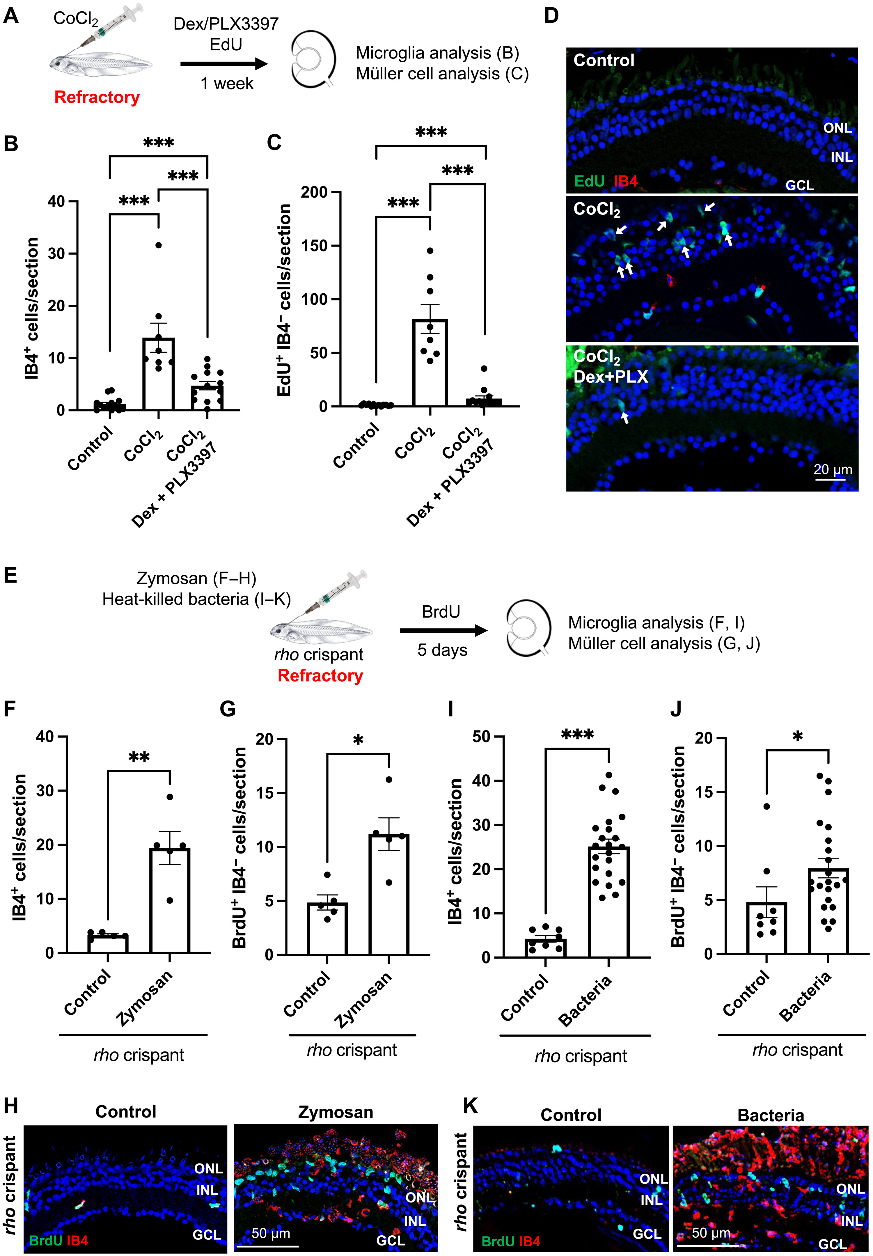 (A) Procedure used in (B) to (D). Tadpoles at a refractory stage were intraocularly injected with 25 mM CoCl2, soaked for 1 week in PLX3397 plus Dex solution, exposed to EdU for the last 3 days and then processed for immunolabeling on retinal sections. (B to D) Quantification of IB4-positive cells [microglia (B)] and EdU-positive, IB4-negative cells [proliferative Müller glia (C)] on retinal sections. Shown in (D) are representative images of retinal sections. Arrows point to EdU-positive/IB4-negative cells in the INL and ONL. (E) Procedure used in (F) to (K). rho crispant tadpoles at a refractory stage were intraocularly injected with zymosan [(F) to (H)] or heat-killed bacteria [(I) to (K)], exposed to BrdU solution for 5 days, and then processed for immunolabeling on retinal sections. (F to K) Quantification of IB4-positive cells [microglia (F) and (I)] and BrdU-positive, IB4-negative cells [proliferative Müller glia (G) and (J)]. Shown in (H) and (K) are representative images of retinal sections. Nuclei are counterstained with Hoechst. Data are represented as means ± SEM, and each point represents one retina. *P < 0.05; **P < 0.01; ***P < 0.001 (Mann-Whitney test). GCL, ganglion cell layer; INL, inner nuclear layer; ONL, outer nuclear layer.