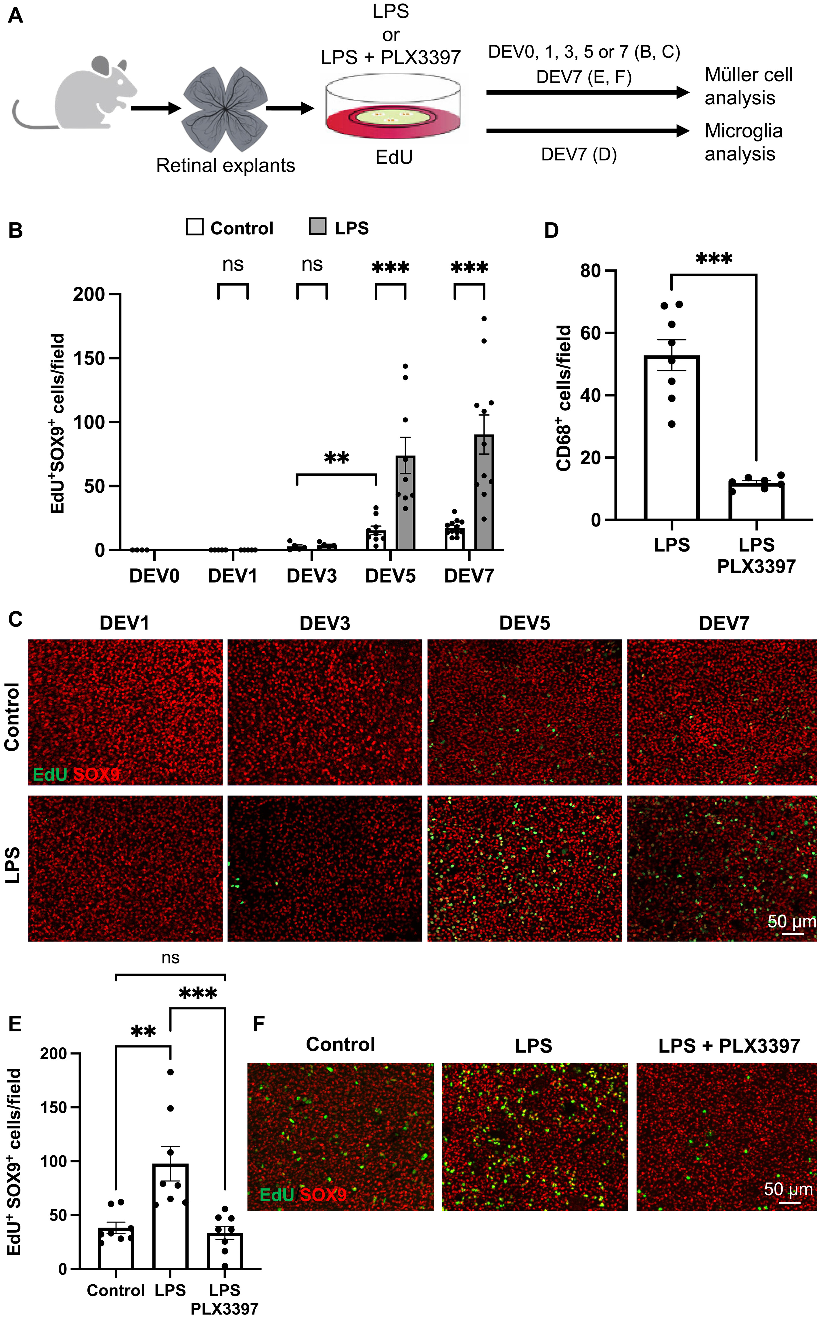 (A) Procedure used in (B) to (F). Retinas from wild-type mice were flattened and cultured for 1 to 7 days (DEV1 to DEV7) in the presence of EdU alone (control) or together with either LPS alone [(B) and (C)] or LPS plus PLX3397 [(D) to (F)]. Retinal explants were then processed for immunostaining analysis. DEV0 corresponds to an uncultured retina. Created using BioRender.com. (B and C) Quantification of double EdU-positive and SOX9-positive cells (proliferative Müller cells) at different time points in control and LPS-treated retinal explants. Shown in (B) are representative images of flat-mounted retinas. (D) Quantification of CD68-positive cells (activated microglia) in retinal explants treated with LPS or with LPS plus PLX3397. (E and F) Quantification of double EdU-positive and SOX9-positive cells in control, LPS-treated, and LPS plus PLX3397-treated retinal explants. Shown in (F) are representative images of flat-mounted retinas. Data are represented as means ± SEM, and each point represents one retinal explant. ns, not significant; **P < 0.01; ***P < 0.001 (Mann-Whitney test).