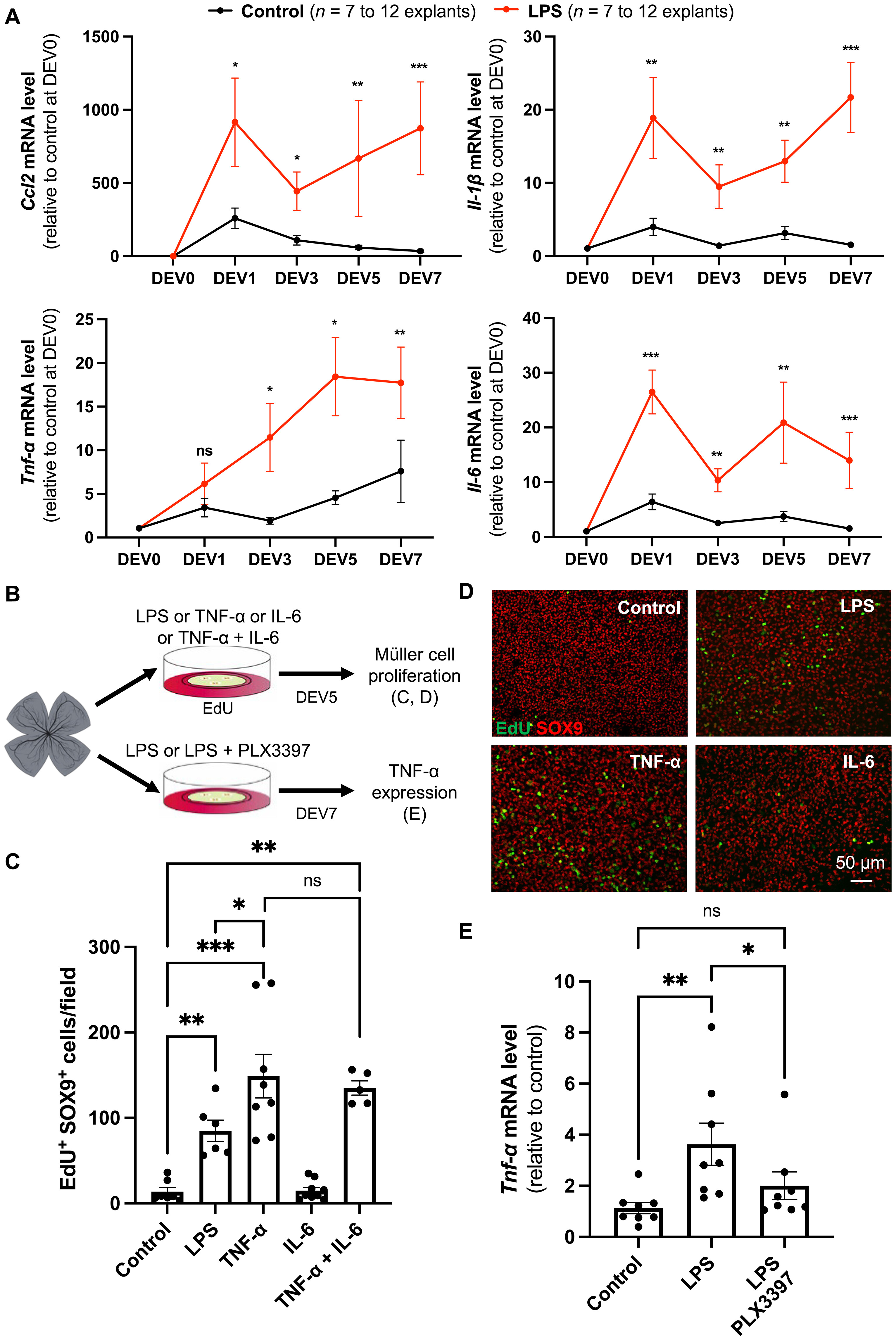 (A) qPCR analysis of Ccl2, Il-1β, Tnf-α, and Il-6 expression in control and LPS-treated retinal explants at different culture time points, relative to uncultured control condition (DEV0). (B) Procedure used in (C) to (E). Retinas from wild-type mice were flattened and cultured for 5 days in the presence of EdU alone (control) or in combination with LPS, TNF-α, IL-6, or TNF-α plus IL-6. Retinal explants were then processed for immunostaining analysis [(C) and (D)]. Other retinal explants were cultured for 7 days in the presence of LPS or LPS plus PLX3397 and subjected to qPCR analysis (E). Created using BioRender.com. (C and D) Quantification of double EdU-positive and SOX9-positive cells (proliferative Müller cells). Shown in (D) are representative images of flat-mounted retinas. (E) qPCR analysis of Tnf-α gene expression. Data are represented as means ± SEM, and each point represents one retinal explant. ns, not significant; *P < 0.05; **P < 0.01; ***P < 0.001 (Mann-Whitney test).