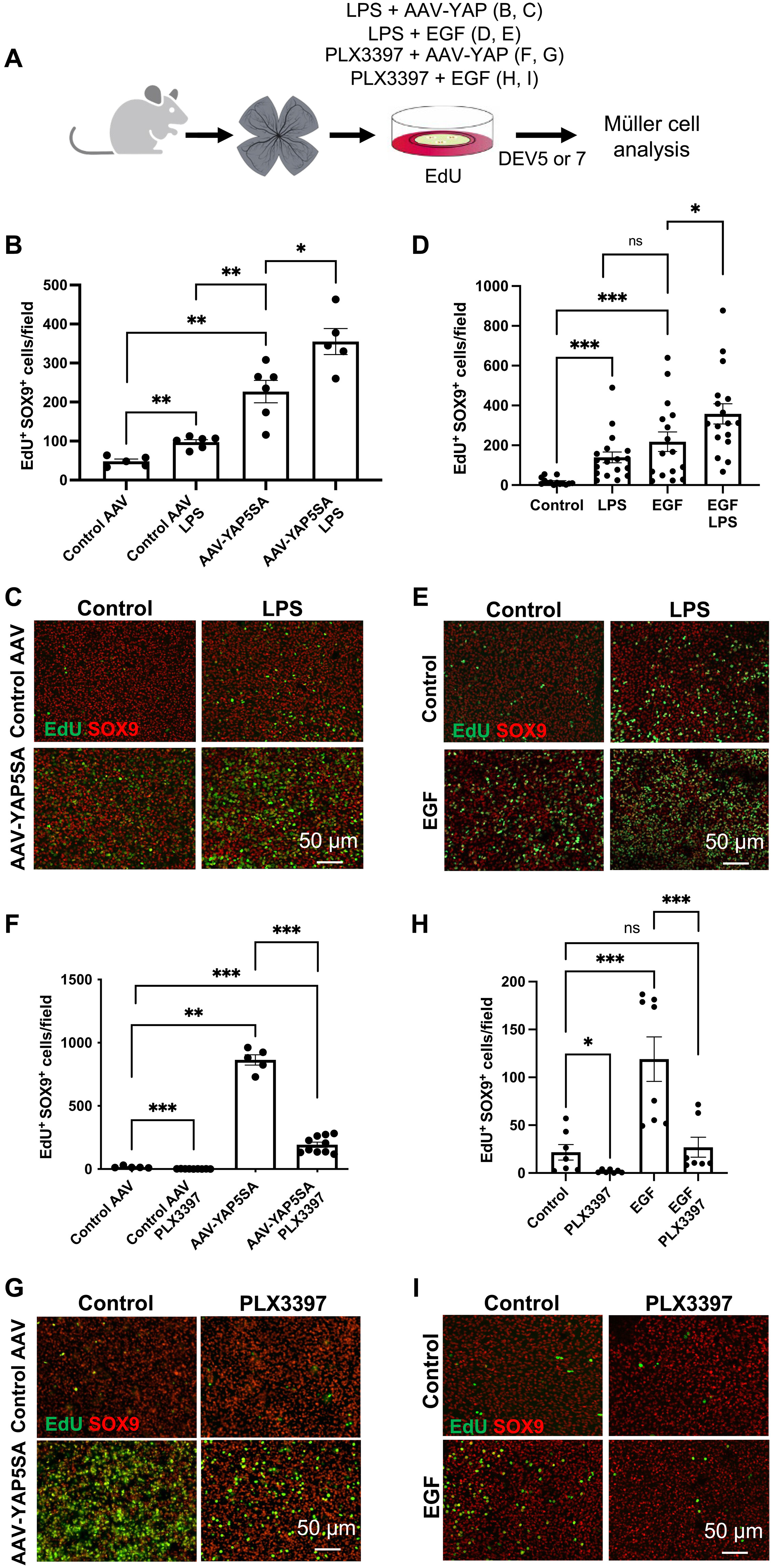 (A) Procedure used in (B) to (I). Retinas from wild-type mice were flattened and cultured for 5 days in the presence of EdU and LPS or PLX3397, together with EGF, or for 7 days if together with AAV-GFP (control AAV) or AAV-YAP5SA. Retinal explants were then processed for immunostaining analysis. Created using BioRender.com. (B to E) Quantification of double EdU-positive and SOX9-positive cells (proliferative Müller cells) in retinal explants exposed to LPS and transduced with either control AAV or AAV-YAP5SA [(B) and (C)] or treated with EGF [(D) and (E)]. Shown in (C) and (E) are representative images of flat-mounted retinas. (F to I) Quantification of double EdU-positive and SOX9-positive cells in retinal explants exposed to PLX3397 and transduced with either control AAV or AAV-YAP5SA (F) or treated with EGF (H). Shown in (G) and (I) are representative images of flat-mounted retinas. Data are represented as means ± SEM, and each point represents one retinal explant. ns, not significant; *P < 0.05; **P < 0.01; ***P < 0.001 (Mann-Whitney test).