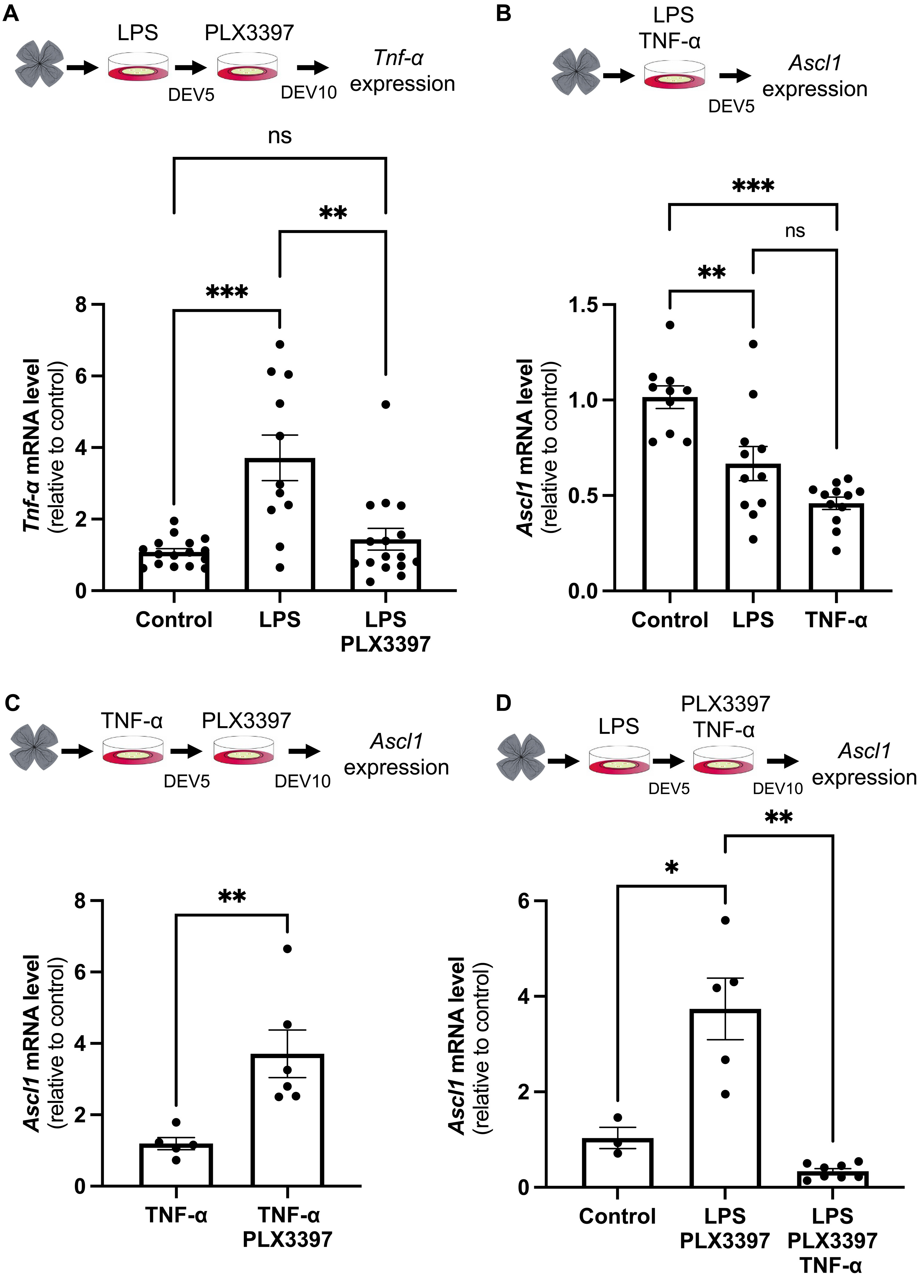 (A) Retinas from wild-type mice were flattened and cultured for 5 days in the presence of LPS and then cultured for an additional 5 days in the presence of PLX3397. Other batches of explants were also cultured for 10 days but were either untreated (control) or only treated with LPS for the first 5 days. Retinal explants were processed for qPCR analysis of Tnf-α expression at DEV10. (B) Retinas from wild-type mice were flattened and cultured for 5 days in the presence of LPS or TNF-α. Retinal explants were processed for qPCR analysis of Ascl1 expression at DEV5. (C) Retinas from wild-type mice were flattened and cultured for 5 days in the presence of TNF-α and then cultured for 5 days with or without PLX3397. Retinal explants were processed for qPCR analysis of Ascl1 expression at DEV10. (D) Retinas from wild-type mice were flattened and cultured for 5 days in the presence of LPS and then cultured for 5 days in the presence of PLX3397 or PLX3397 plus TNF-α. Retinal explants were processed for qPCR analysis of Ascl1 expression at DEV10. Data are represented as means ± SEM, and each point represents one retinal explant. ns, not significant; *P < 0.05; **P < 0.01; ***P < 0.001 (Mann-Whitney test). Created using BioRender.com.