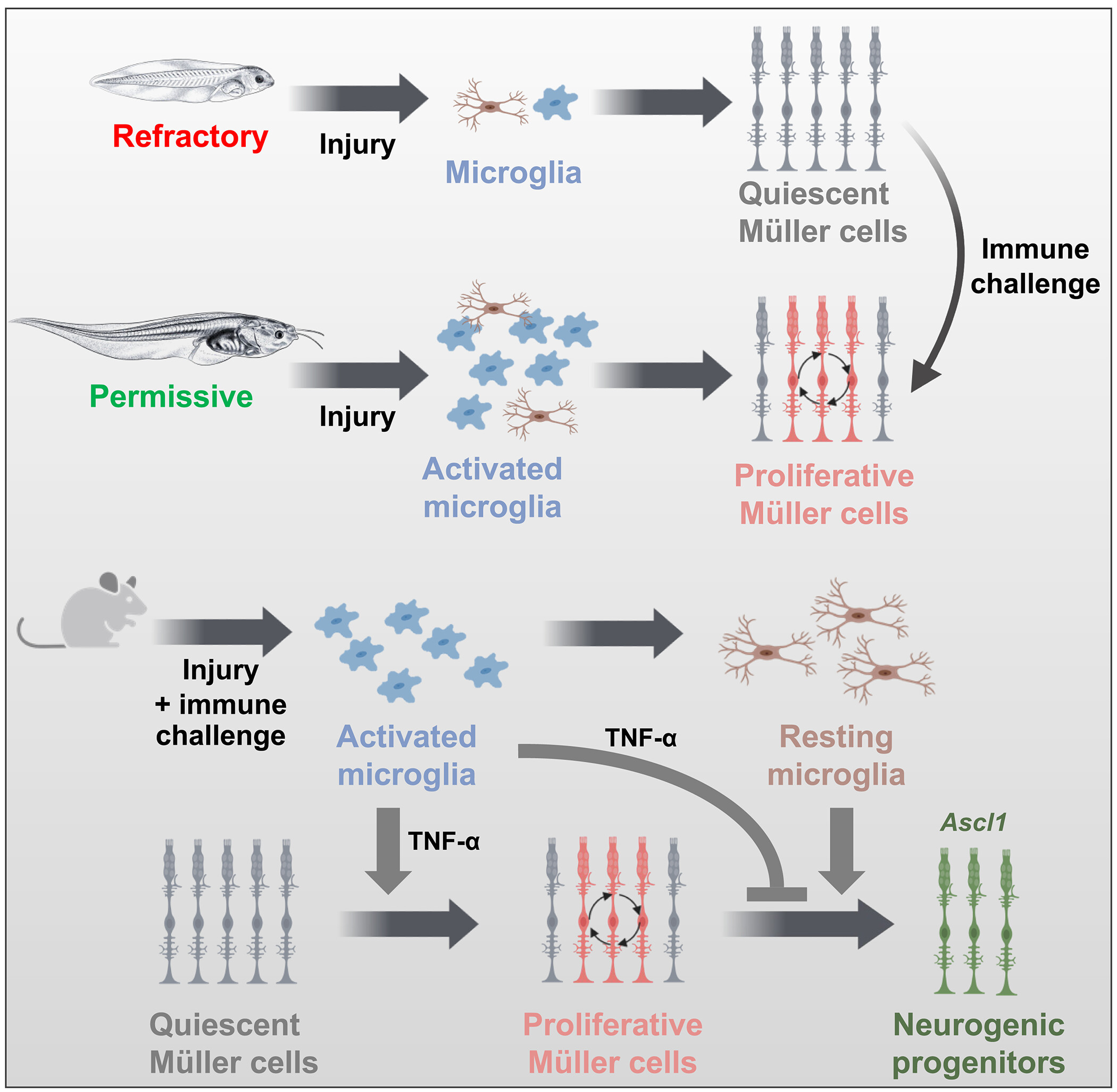 In young Xenopus tadpoles (refractory stages), there are very few microglia in the retina, which could account for the very limited proliferative response of Müller cells in a variety of retinal injury models. In contrast, microglia are more abundant in old tadpoles (permissive stages) and are required for Müller glia to reenter into the cell cycle upon injury. At refractory stages, Müller cells can become proliferative following retinal damage if an immune challenge is provided. In mice, an immune challenge also promotes the proliferation of Müller cells but inhibits their neurogenic potential. An inflammatory state must be sequentially activated and attenuated to achieve both proliferation and neurogenic gene expression. Last, we identified TNF-α as at least one of the cytokines that mediates both proliferative and antineurogenic effects of microglia on Müller cells. Created using BioRender.com.