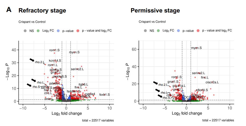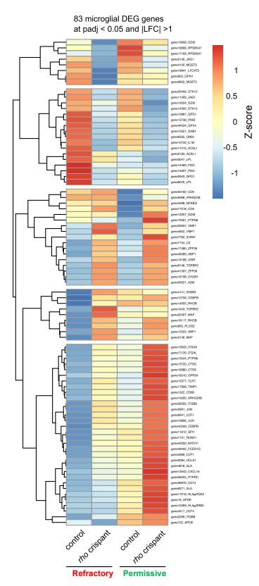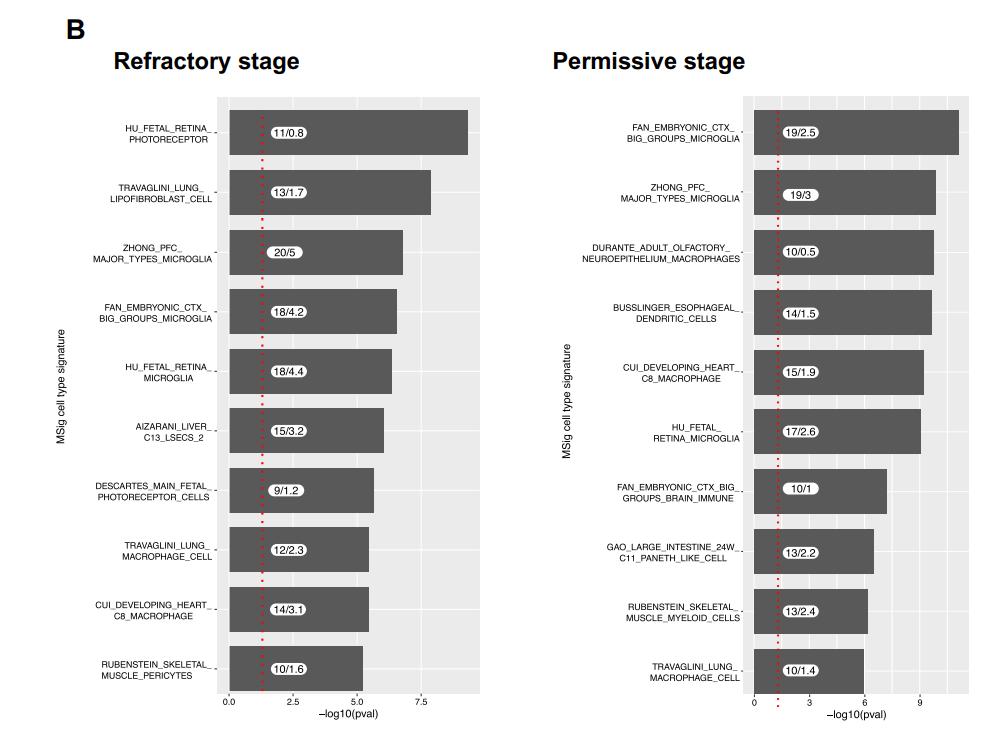 are statistically differentially expressed (|LFC| >1, padj <0.05) at refractory and permissive stages,