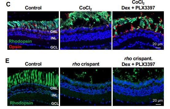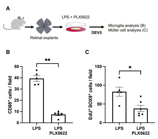 flattened and cultured for 5 days in the presence of EdU plus LPS, or plus LPS and PLX5622. Retinal
