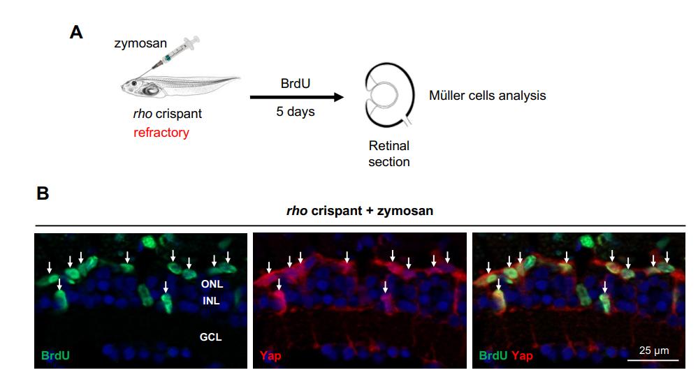 Figure S6. Proliferative cells upon zymosan injection at the refractory stage are Müller cells. (A)