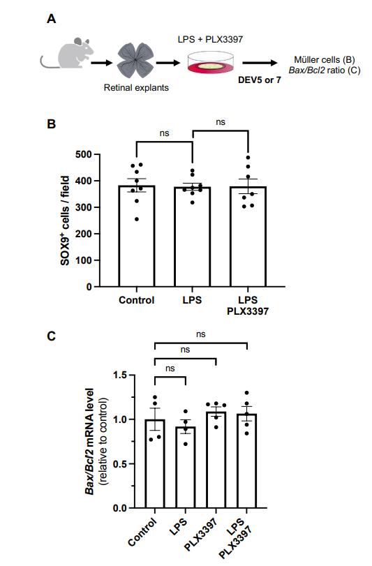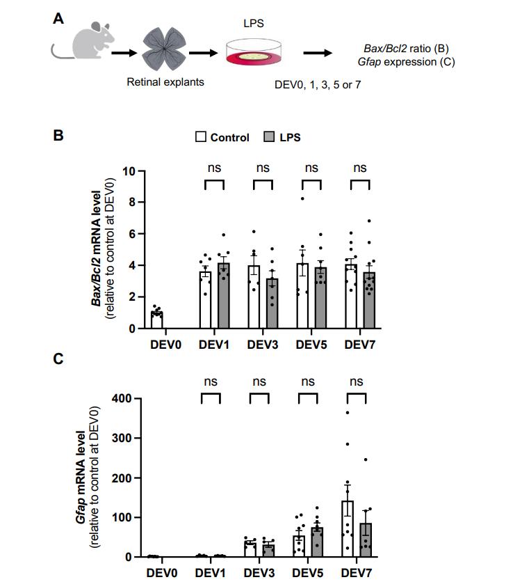 of Bax/Bcl2 expression ratio (B) or Gfap expression (C) in control and LPS-treated retinal explants at