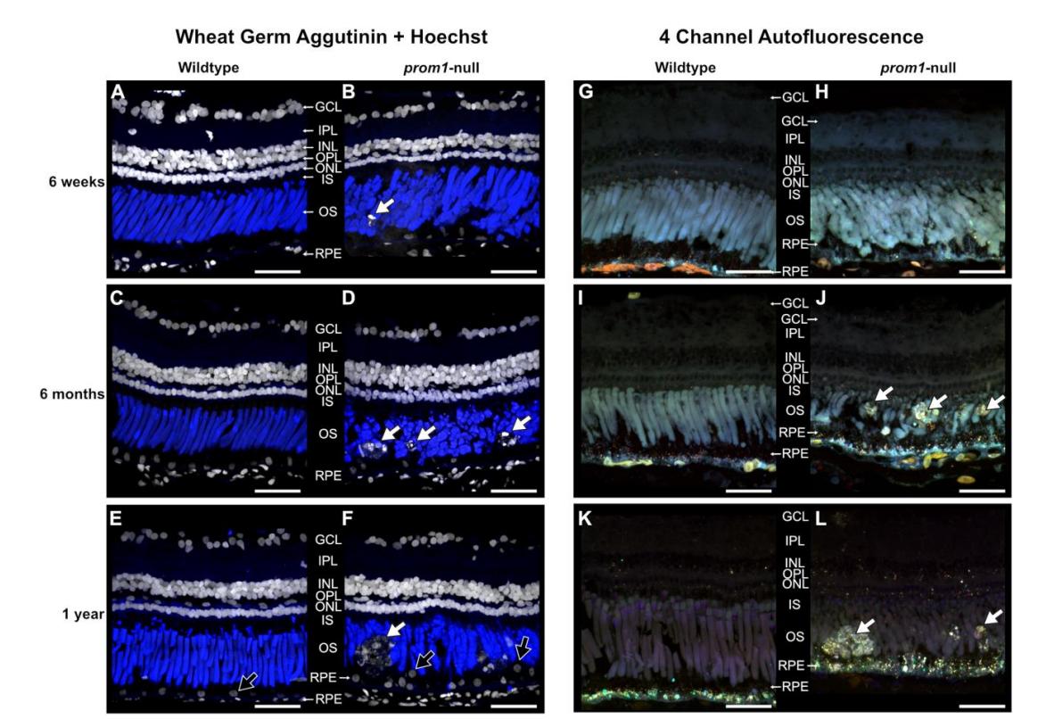 autofluorescent puncta in the RPE layer of prom1-null frogs (H, J, L) compared to the