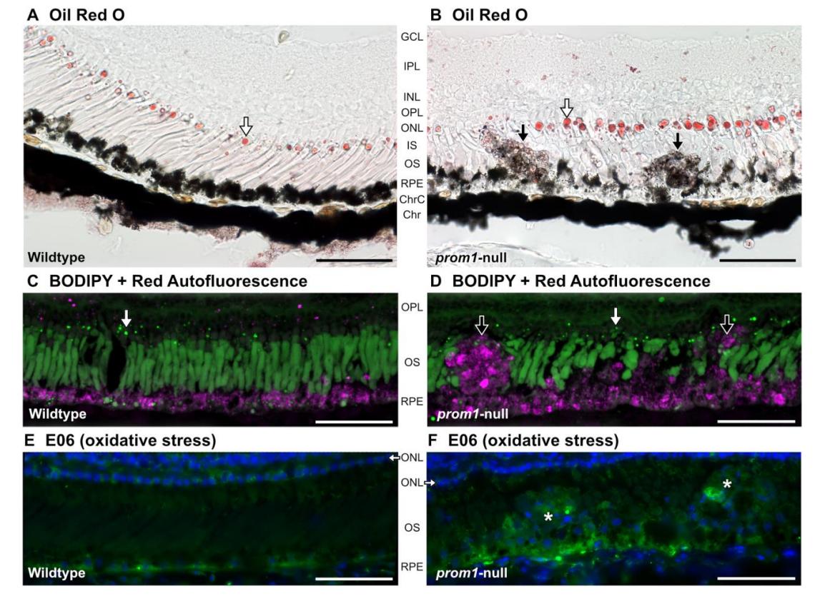 wildtype (A,C,E) and prom1-null (B,D,F) retinas. Both Oil Red O (A,B) and BODIPY