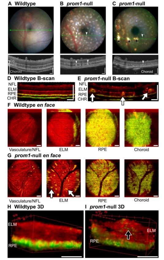 the RPE of prom1-null animals as well as the SDD-like deposits (black arrows), but