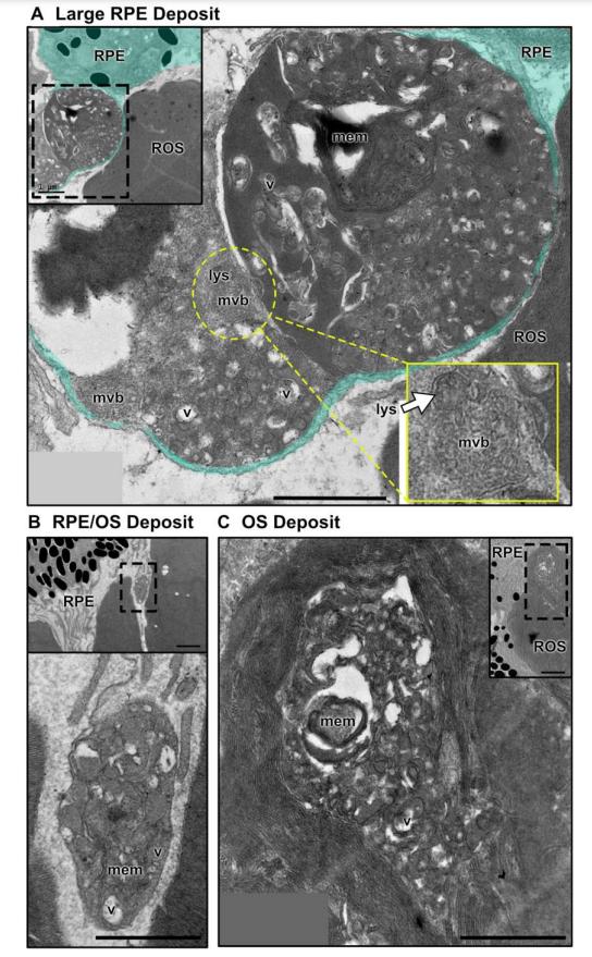 localized in (A,B) or near (C) the RPE and contain electron dense material, membranes