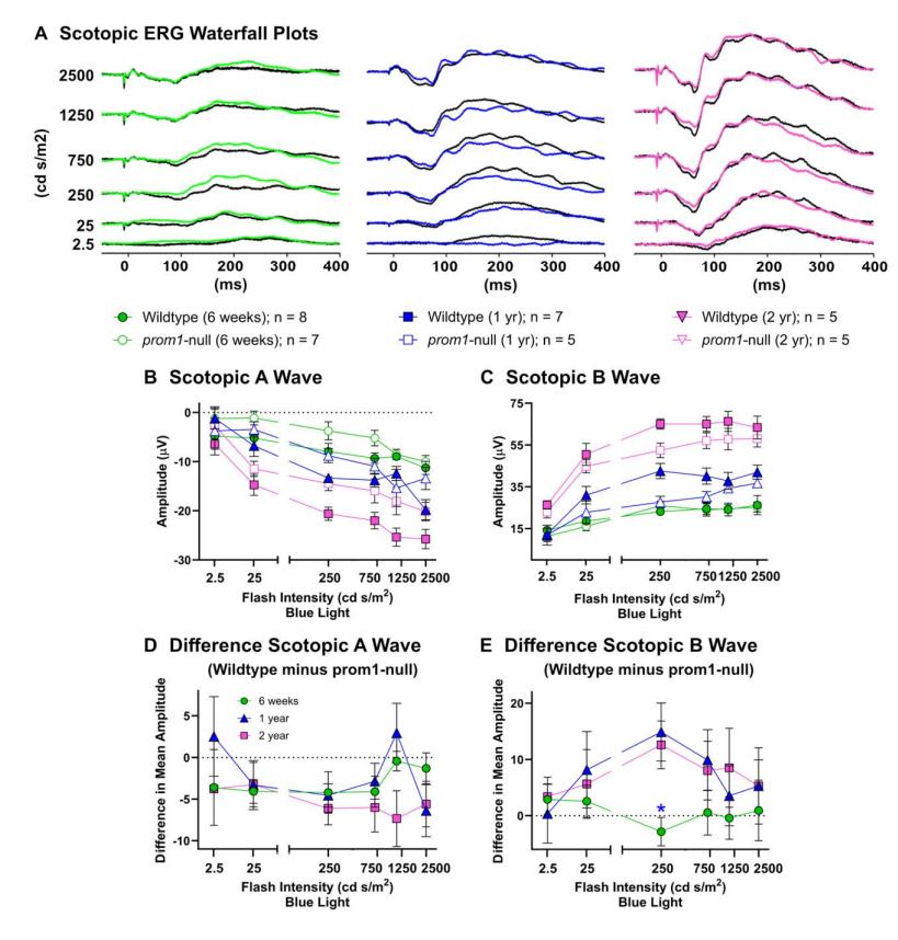 amplitude between wildtype and prom1-null animals. E) The difference in scotopic Bwave response amplitude between wildtype and prom1-null animals. Number of animals