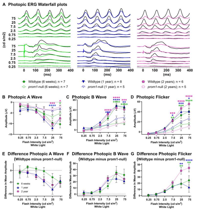 Gross photopic flicker response amplitude of wildtype and prom1-null animals. E) The