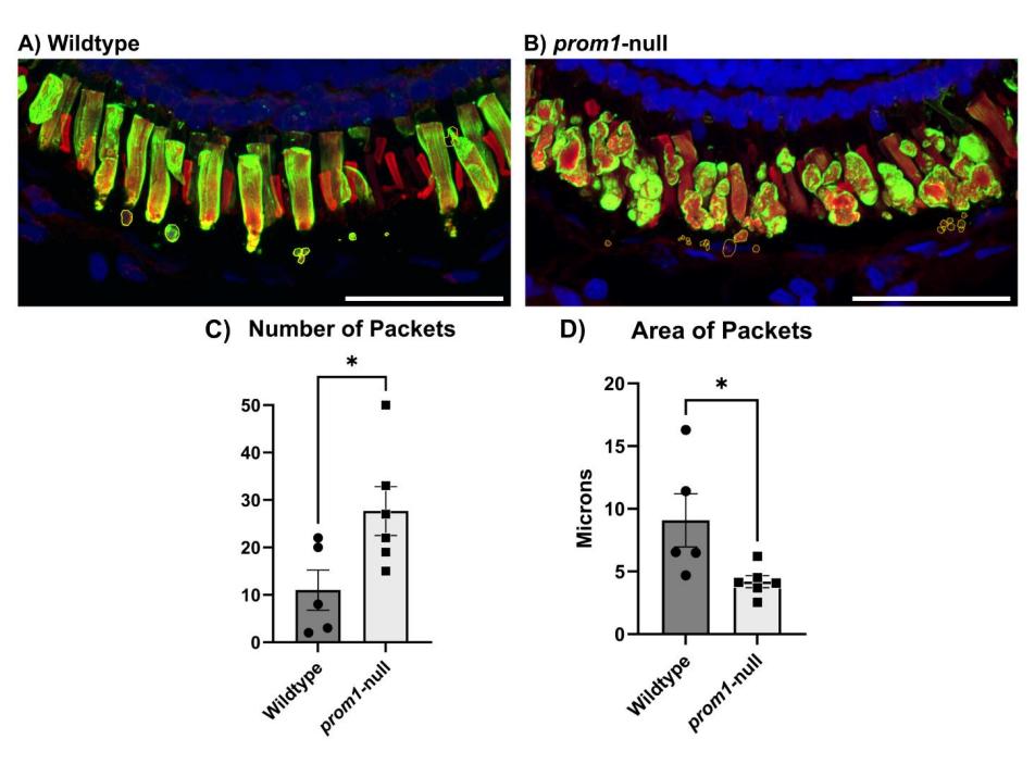 deposits (B,F) and migrate further into the outer segment layer than in wildtype animals (B,D,F). Scale bars = 50 µm. Number of animals: Wildtype, n = 5; prom1-null, n = 9.