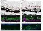 Micrograph labels: Magenta, wheat germ agglutinin; Green, cone opsin; blue, Hoechst