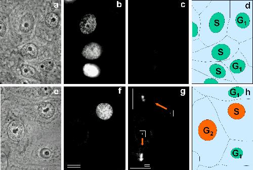 Recovery of Aurora A in the centrosome region in S-phase. Phase contrast (a,e) and immunofluorescent labeling with antibodies against Bromodeoxyuridine (BrdU) (b,f) or antibodies against Aurora A (c,g, and inserts). Inserts (in g) present enlarged centrosomal regions of Aurora A-positive cells. On schemes (d,h), nuclei of Aurora A-negative cells are shown in green, and nuclei of Aurora A-positive cells are shown in orange. Bar: 10 µm (a–h) and 1 µm (inserts in g).