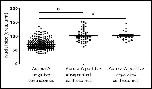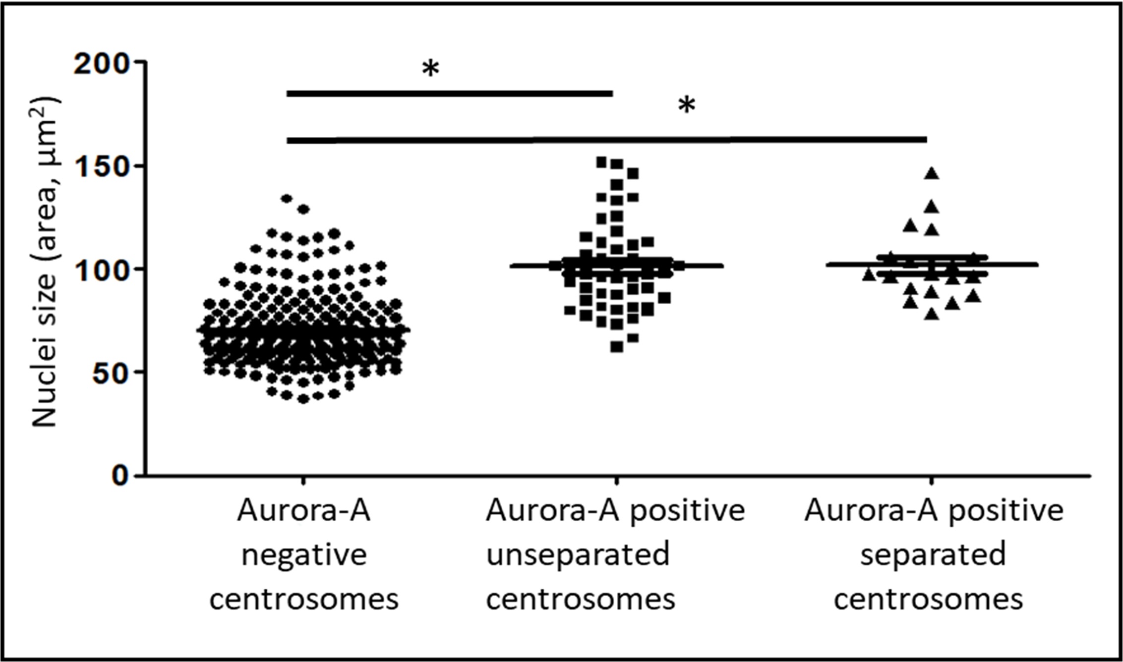 Dependence of the presence of Aurora A kinase in the centrosome region and centrosome separation from the size of nuclei in the XL2 cell line. The area of the nucleus in cells with Aurora A-negative centrosomes (n = 226), Aurora A-positive non-separated centrosomes (n = 67), and Aurora A-positive separated centrosomes (n = 19). * marks statistically significant differences between the groups (p