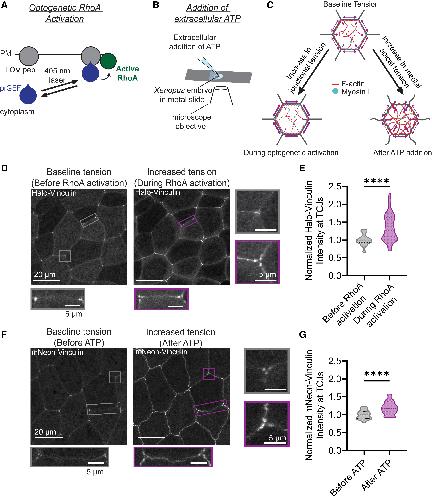 (C) Schematic of observed cellular responses to optogenetic activation of RhoA and additional of extracellular ATP. Arrows represent expected forces, with thicker arrows representing more force.