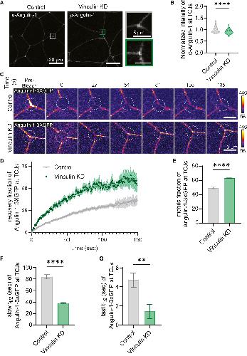 (C) Montage of Angulin-1-3xGFP FRAP in control and Vinculin KD embryos pre-bleach and post-bleach. Dashed circle indicates photobleached region. Images are shown using the FIRE lookup table (LUT).