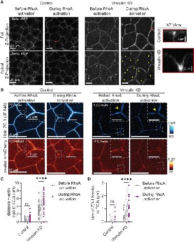 (B) Live confocal images of control and Vinculin KD embryos that express ZO-1 (Halo-ZO-1 with JF646), α-catenin (α-catenin-mCherry), photo-recruitable GEF (prGEF-YFP), and LOVpep (GFP-silent-LOVpep). Max z projections are shown at both baseline tension (before RhoA activation) and increased Rho-mediated tension (during RhoA activation). Yellow arrowheads point to breaks in ZO-1 signal at TCJs.