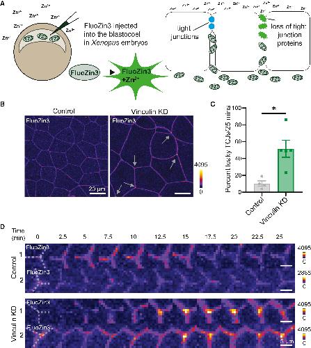 (B) Live confocal images of FluoZin3 signal in control and Vinculin KD embryos. Images are shown using the FIRE LUT, adjusted in the same way for each image. Gray arrows point to increased FluoZin3 signal at TCJs.