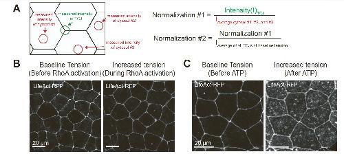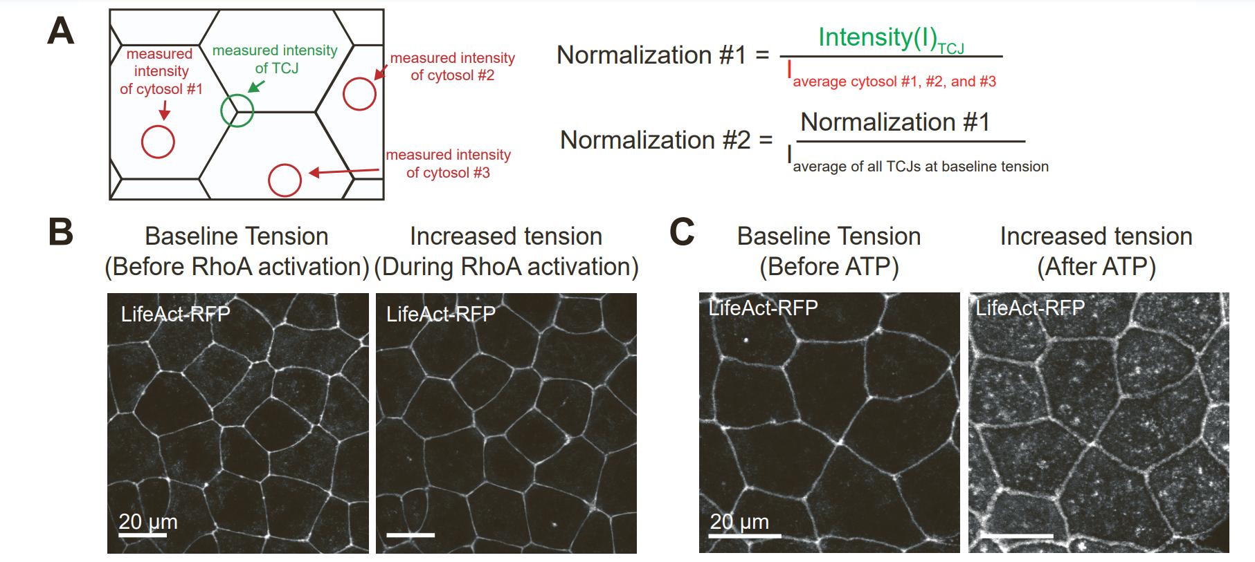 A) Schematic of process for quantifying normalized Vinculin intensity at TCJs and formulas